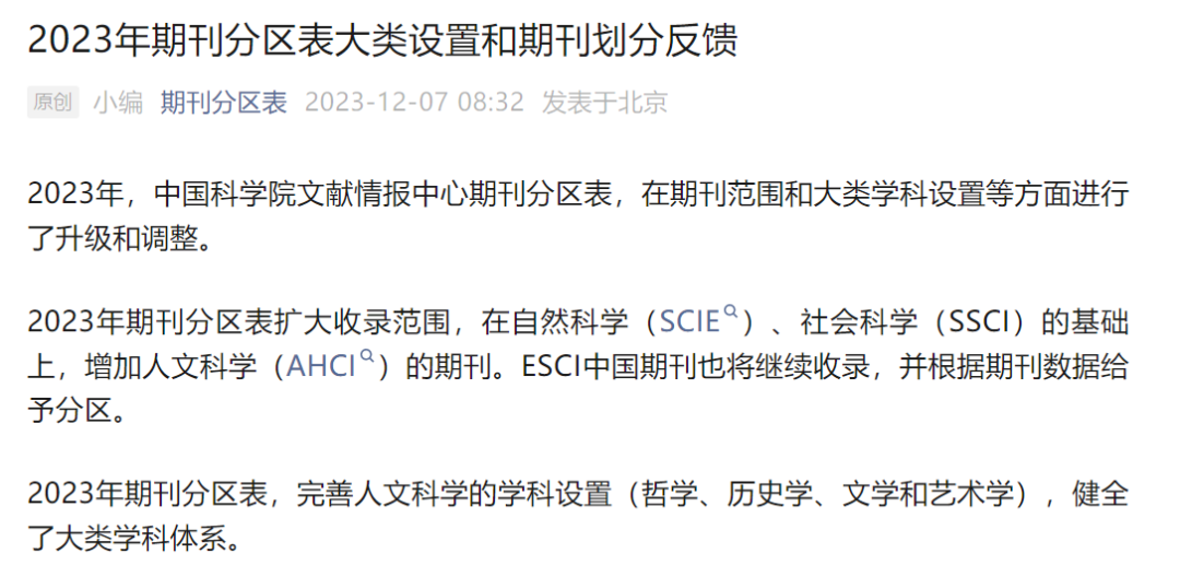 同时,2023年期刊分区表将扩大收录范围,增加人文科学(AHCI)期刊;
