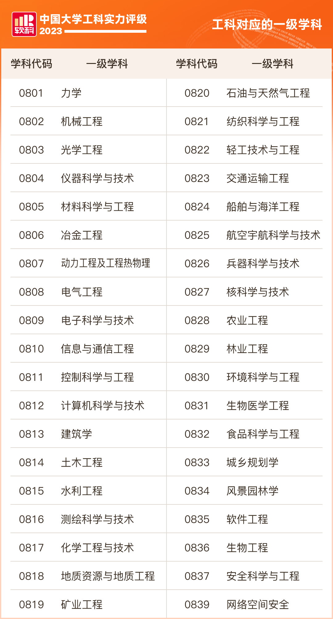 中国大学工科实力评级的对象为所有被纳入2023软科中国大学排名的高校。工科的范围包括工学门类的38个学科,具体如下: