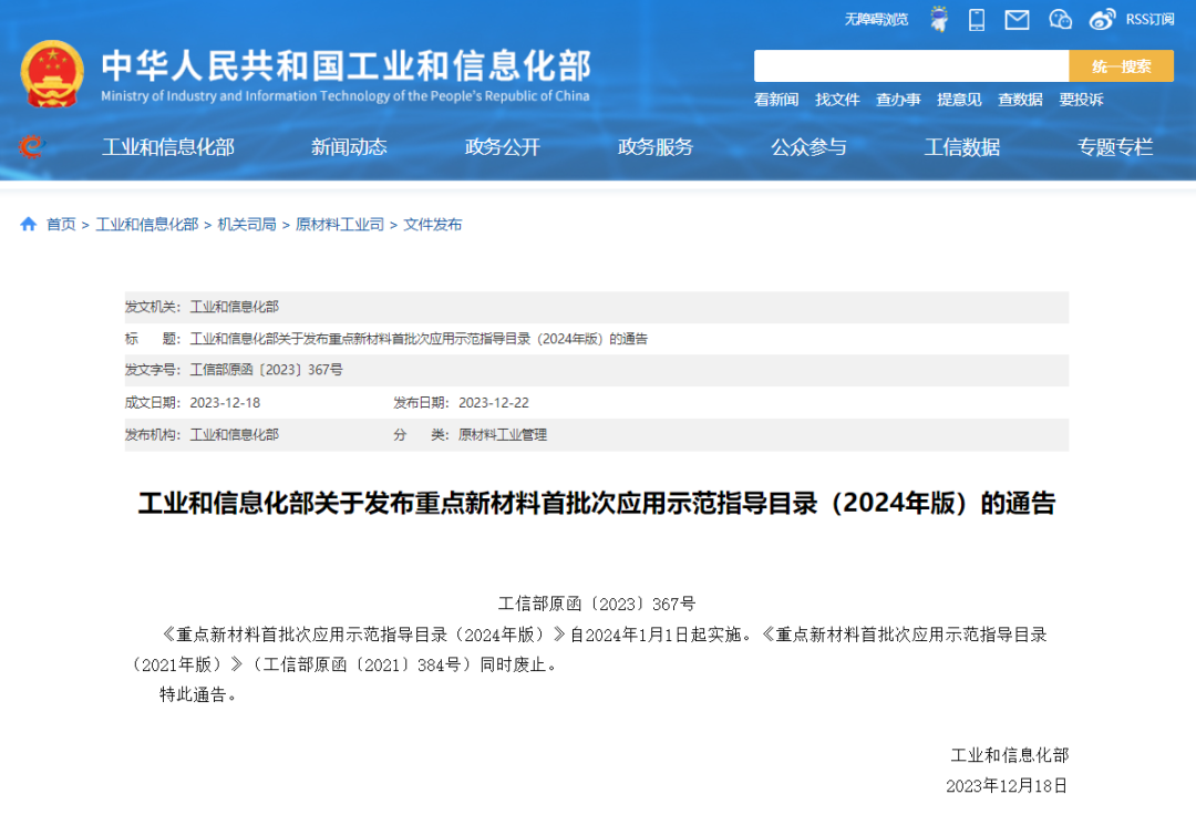 12月22日,工业和信息化部发布《工业和信息化部关于发布重点新材料首批次应用示范指导目录(2024年版)的通告》(以下简称“《目录》”)。