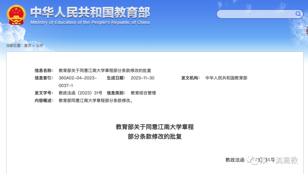 日前,教育部网站公布了《教育部关于同意江南大学章程部分条款修改的批复》,在《江南大学章程修正案(2023年核准稿)》中明确了“江南大学是一所拥有悠久办学历史、深厚文化积淀的教育部直属全国重点大学”。