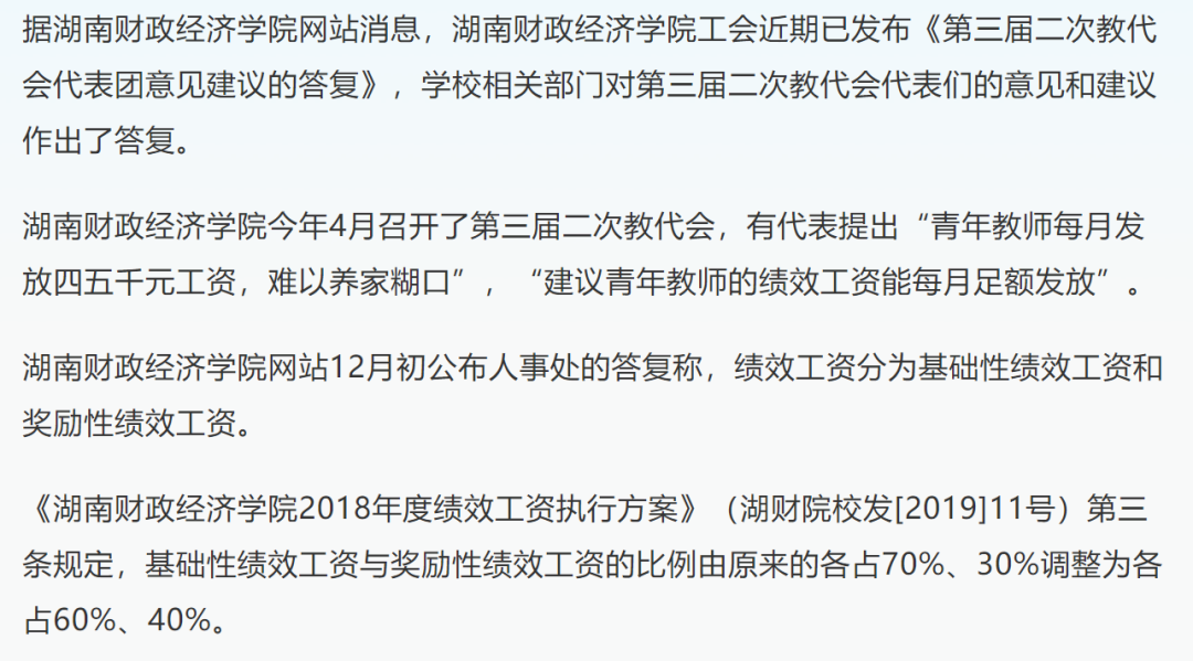 湖南财政经济学院今年4月召开了第三届二次教代会,有代表提出“青年教师每月发放四五千元工资,难以养家糊口”,“建议青年教师的绩效工资能每月足额发放”。