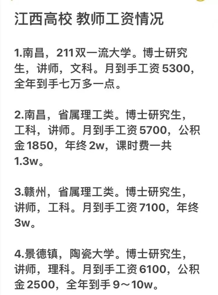近日,也有网友爆料称,江西部分高校教师年薪仅10万元左右,大概情况如下: