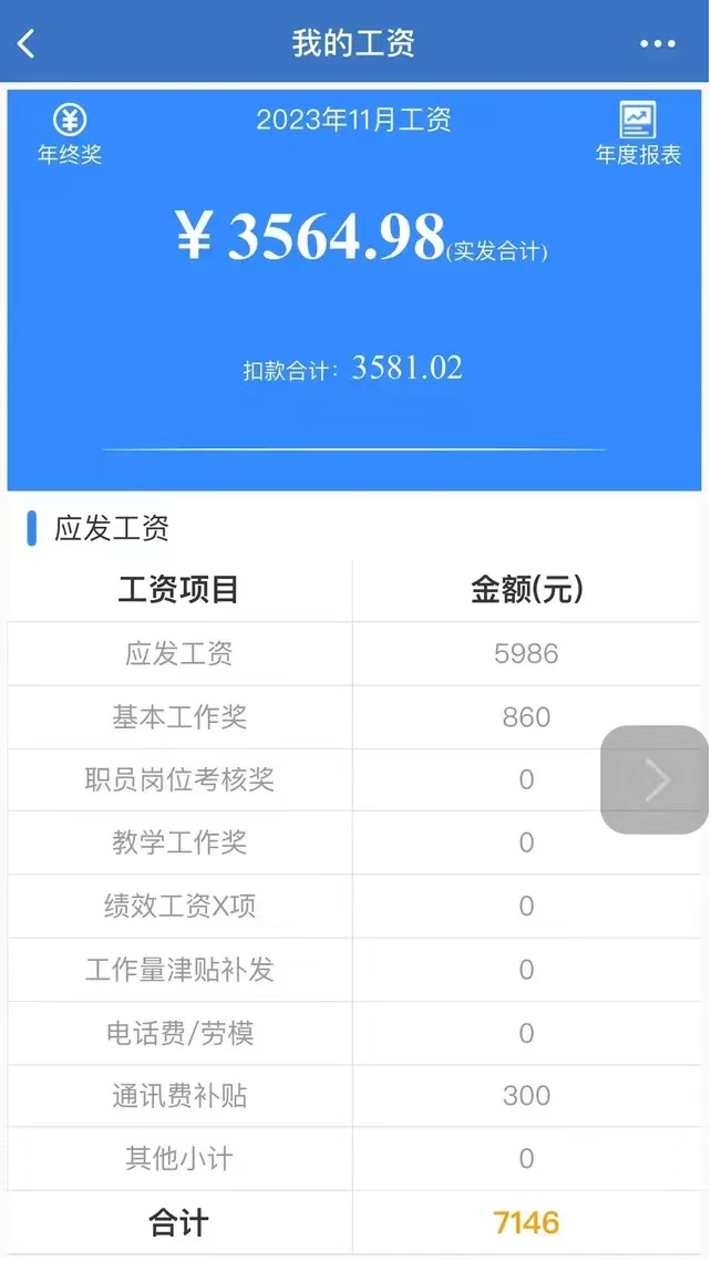 对于该网友的发文,浙江一高校青年教师发表评论,直接晒出了自己的工资条,合计薪资仅为7146元。