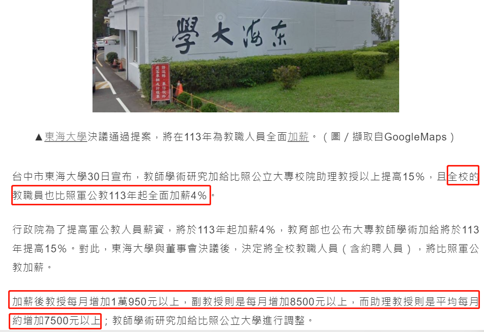 台湾省的东海大学宣布,全校教职员2024年起全面加薪4%。据悉,加薪后教授每月增加1万950元新台币(约合人民币2495元)以上,副教授每月增加8500元新台币(约合人民币1937元)以上,助理教授平均每月增加7500元新台币(约合人民币1709元)以上。