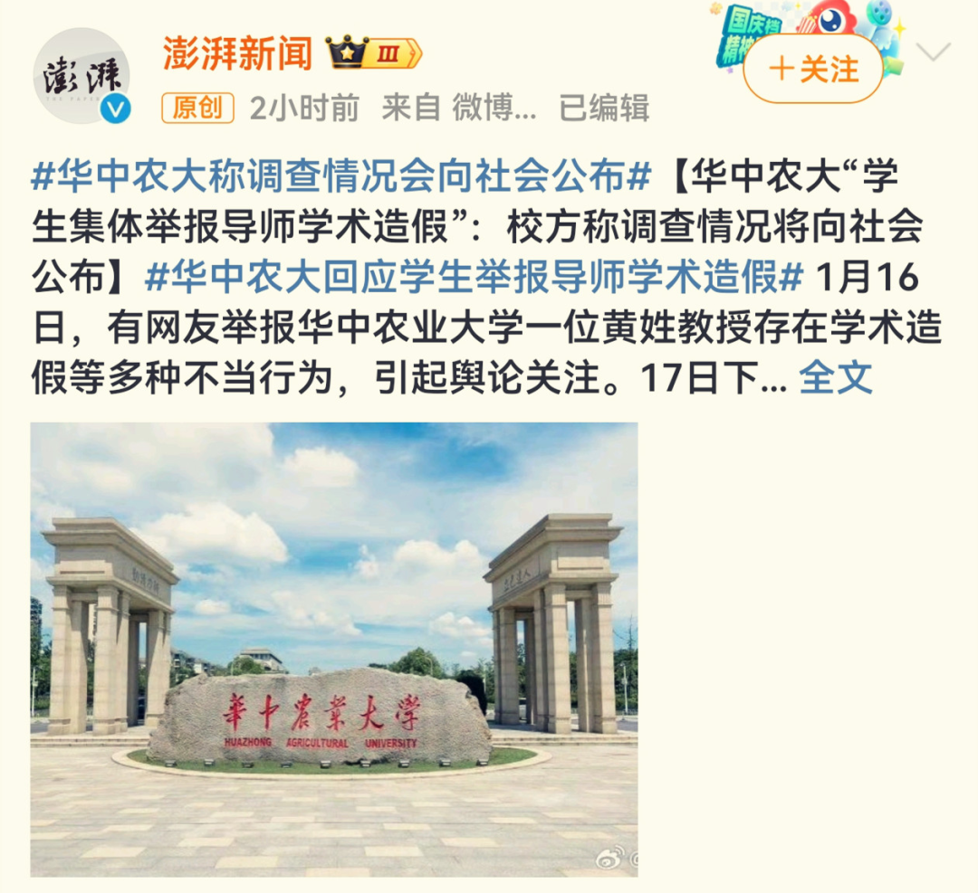 勇敢者是不可再生资源, 大家一定要爱护珍惜。 01 1月16日, 华中农业大学11名硕士和博士研究生, 联名举报了自己的导师黄某某。