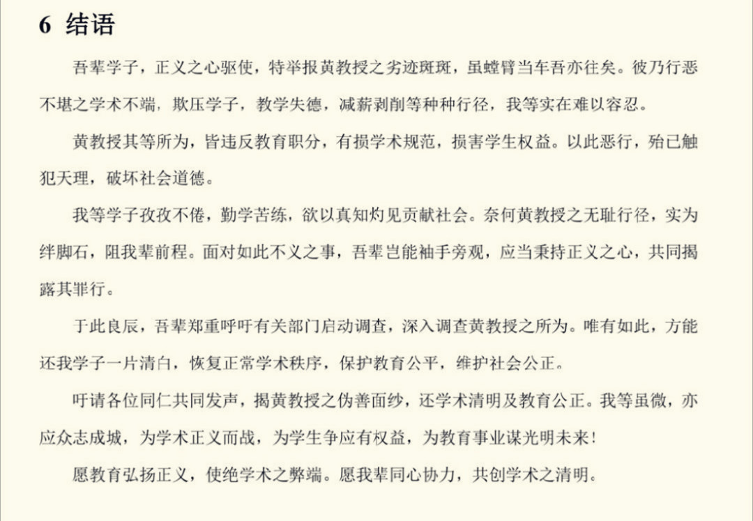 13 125页的举报信, 还有一个非常让我感动的地方, 就是他们的“结语”, 这个结语写得真的太好了: “我等学子孜孜不倦,勤学苦练, 欲以真知灼见贡献社会。 奈何黄教授之无耻行径, 实为绊脚石,阻我辈前程。 面对如此不义之事, 吾辈岂能袖手旁观, 应当秉持正义之心, 共同揭露其罪行。” “我等虽微, 亦应众志成城, 为学术正义而战, 为学生争应有权益, 为教育事业谋光明未来! 愿教育弘扬正义, 使绝学术之弊端。 愿我辈同心协力, 共创学术之清明。”
