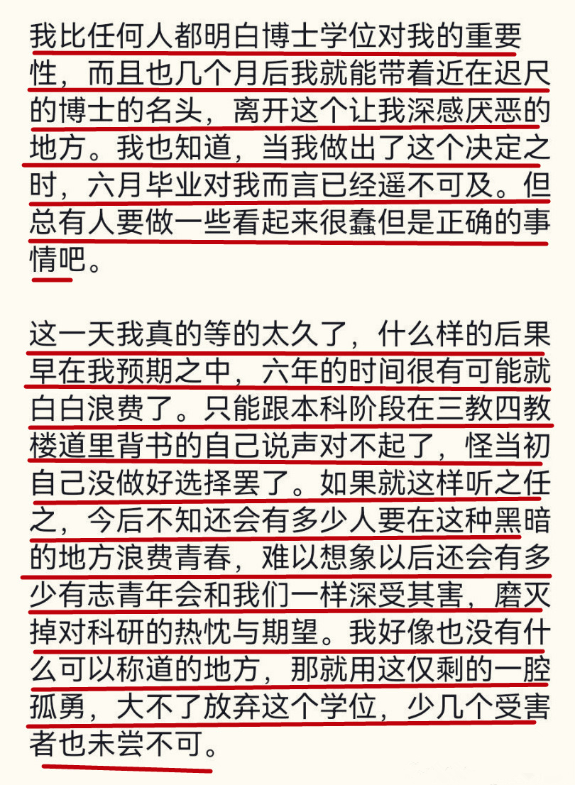 04 他们中的一些人, 还有5个多月就毕业了, 只需再忍受那么几个月, 只需睁一只眼闭一只眼, 就可以很顺利拿到学位, 但他们最终还是选择了举报, “我比任何人都明白博士学位对我的重要性, 而且也几个月后, 我就能带着近在咫尺的博士的名头, 离开这个让我深感厌恶的地方。 我也知道, 当我做出了这个决定之时, 六月毕业对我而言已经遥不可及。 但总有人要做一些看起来很蠢但是正确的事情吧。 这一天我真的等的太久了, 什么样的后果早在我预期之中, 六年的时间很有可能就白白浪费了。 只能跟本科阶段在三教四教楼道里背书的自己说声对不起了, 怪当初自己没做好选择罢了。 如果就这样听之任之, 今后不知还会有多少人, 要在这种黑暗的地方浪费青春, 难以想象以后还会有多少有志青年, 会和我们一样深受其害, 磨灭掉对科研的热忱与期望。 我好像也没有什么可以称道的地方, 那就用这仅剩的一腔孤勇, 大不了放弃这个学位, 少几个受害者也未尝不可。”