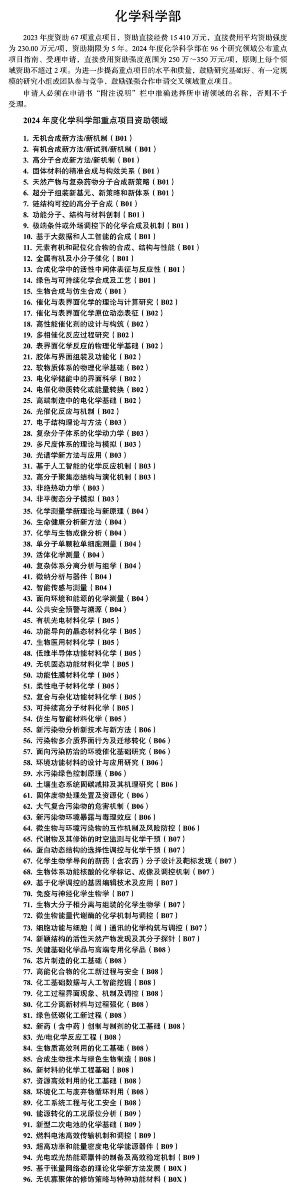 近日,《2024年度国家自然科学基金项目指南》正式发布,其中重点项目支持从事基础研究的科学技术人员针对已有较好基础的研究方向或学科生长点开展深入、系统的创新性研究,促进学科发展,推动若干重要领域或科学前沿取得突破。为更好地服务广大科技工作者,小编对指南中各学部重点项目的优先资助领域进行了梳理,仅供参考。具体内容请参见国家自然科学基金委员会官方网站。 数学物理科学部 化学科学部 生命科学部 地球科学部 工程与材料科学部 信息科学部 管理科学部 医学科学部