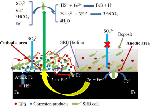 海洋环境中微生物腐蚀问题思考 据NACE Impact研究显示,全球所有腐蚀的年成本为2.5万亿美元(不包括安全和环境影响),细菌腐蚀(MIC)造成的经济损失占总的约20%。典型的腐蚀性微生物包括细菌、真菌、古菌和微藻等,在金属材料的腐蚀过程中发挥着重要的作用,需引起腐蚀控制工作者足够的重视。 特别在海洋环境中微生物种类众多,金属材料服役的环境会愈加复杂苛刻。此外,MIC受到的影响因素众多,作用过程极其复杂,微生物自身的生命活动、生物膜和有机及无机代谢产物等都显著地影响着金属的腐蚀过程,MIC过程和机理仍需进一步深入探究。 在MIC过程中发挥最主要作用的是微生物,不同种类微生物对金属腐蚀机制存在巨大差异。 (1)细菌 细菌导致的金属材料腐蚀失效问题被广泛研究,常见的腐蚀性细菌可分为硫酸盐还原菌(SRB)、硝酸盐还原菌(NRB)、铁氧化细菌(IOB)和产酸细菌(APB)等。其中,SRB是一种典型的且腐蚀性极强的厌氧菌(图1),它们可以在pH 4.0~9.5和温度25~60 ℃范围内生长,能够承受高达500个大气压力。 SRB的典型特征是可以将硫酸盐作为电子受体,并将其还原为硫化物。SRB对金属的腐蚀性极强,其通常利用有机碳源作为电子供体,但是在有机碳源匮乏的条件下,其可以利用Fe作为电子供体促进硫酸盐的还原,从而显著加速金属腐蚀。根据代谢类型,SRB导致的厌氧MIC机制可以分为两种,一种为细胞外电子传递的微生物腐蚀,另一种是微生物在新陈代谢过程中分泌的腐蚀性代谢产物引起的微生物腐蚀。 图1 不同种类的SRB透射电镜图片 (a)湛江油田脱硫弧菌 (b)渤海油田脱硫肠状菌属 (2)真菌 真菌广泛存在于生态系统中,生命力非常顽强,可长时间在不同的环境中生存,具有很强的生物相互作用能力,易适应外界不良的环境。真菌能够很好的附着在金属材料表面,并形成一层生物膜如图2所示,而生物膜的形成直接影响了金属材料电化学腐蚀过程。 真菌通常会释放一些有机酸,如草酸和柠檬酸等强金属螯合剂,同时代谢产生的有机酸可以显著降低环境的pH,进而导致阴极反应加速,从而促进金属腐蚀。酸蚀机制常用来解释真菌导致的MIC,但研究表明某些真菌(如霉菌)可以通过直接或间接的方式从金属材料获取电子进而促进金属腐蚀。 图2 典型霉菌生物膜形貌图 (3)古菌 除了细菌和真菌,古菌也是微生物群落的重要组成部分。古菌在地球上的分布非常广泛,大多分布在极端环境中,如酸性或碱性土壤、深海、极地地区或严格的厌氧环境。在这些环境中,普通细菌很难生存,古菌占主导地位。 古菌可分为多种不同的类型,包括产甲烷古菌、嗜热古菌、嗜盐古菌、嗜酸古菌和氨氧化古菌等。产甲烷古菌是一种产生甲烷的厌氧、化学自养或化学异养的古菌之一,通常存在于湿地、海洋沉积物、厌氧废水处理、温泉和海底热液喷口等缺氧环境中。嗜热古菌Thermophilic archaea主要生活在60~80°C之间,但也有一些嗜热古菌生长的最适温度可以达到100°C,甚至可以在高达120°C的环境中生长繁殖,其主要依靠脂肪酸代谢产物的分泌加速金属腐蚀。近年来研究者们发现古菌在金属腐蚀中发挥着重要作用,西澳大利亚海洋中碳钢的铁锈中甲烷古菌占所有微生物的53.5%。 图3 古菌和微藻的微观图 (左)古菌 (右)微藻 (4)微藻 藻类是一类全球分布的光合作用生物体,分布的范围极广,环境适应性较强,普遍表现出很强的繁殖能力。根据它们的色素、形态和生理特性,可分为褐藻、绿藻和红藻。海洋藻类,主要生长在热带和亚热带海岸。 海洋环境中微藻是对金属材料生物污损贡献较大的生物之一。大部分微藻和细菌之间会相互作用,造成金属材料严重的腐蚀和污损问题。生物膜的存在有利于藻类孢子和硅藻细胞的吸附和生长;一些细菌受益于藻类光合作用产生的氧气和分泌的有机碳类代谢物,而另一些附生细菌,也会阻碍藻类在金属材料表面的附着。藻类除了导致严重生物污损,也会促进金属腐蚀,如希瓦氏藻生物膜会加速316L不锈钢腐蚀。 目前普遍认可腐蚀机制的是,MIC与生物膜的形成和发展息息相关。微生物向金属表面迁移、附着和生长,诱发MIC,过程中伴随着代谢产物、腐蚀产物和环境中的一些无机矿物和有机物的不断积累进而形成生物膜。生物膜是一个动态系统,膜内外的pH值、离子、气体和微生物的浓度等腐蚀因子存在梯度差,生物膜就会作为一个中间载体,是物质传递、运输和腐蚀反应发生的重要场所。 生物膜的结构和组成是微生物促进或抑制金属材料腐蚀的关键因素。不同的微生物形成的生物膜往往存在差异,在实际复杂的自然环境中,不可能存在单一的微生物,常是多种微生物聚集而成的群落,微生物间的协同或拮抗作用将改变金属腐蚀的结果。 如好氧型微生物形成生物膜、消耗氧气为腐蚀性厌氧微生物提供相对缺氧的环境,从而显著加快金属腐蚀过程;而多种厌氧微生物共存时,相互竞争造成营养物质和生存空间的缺乏,进而腐蚀性微生物活性下降,对金属腐蚀也会减弱。 因此,探究MIC机制,需要从微观角度阐明生物膜形成机制,揭示生物膜组成、结构与细菌种类和活性等因素之间的耦合关联关系。 图4 SRB增强含有沉积物电极和裸电极之间的电偶腐蚀行为机制 海洋环境中油气田微生物腐蚀研究是一个系统的工程,基础是微生物种群结构的分析和鉴定、微生物腐蚀行为和机制,落脚点是