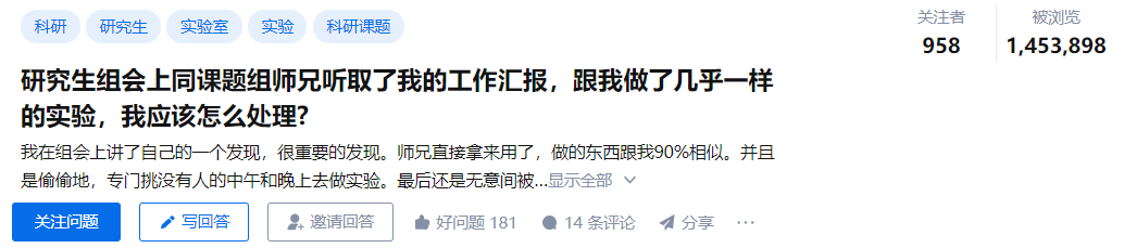 知乎上也曾有这样的一个话题,“研究生组会上同课题组师兄听取了我的工作汇报,跟我做了几乎一样的实验,我应该怎么处理?”