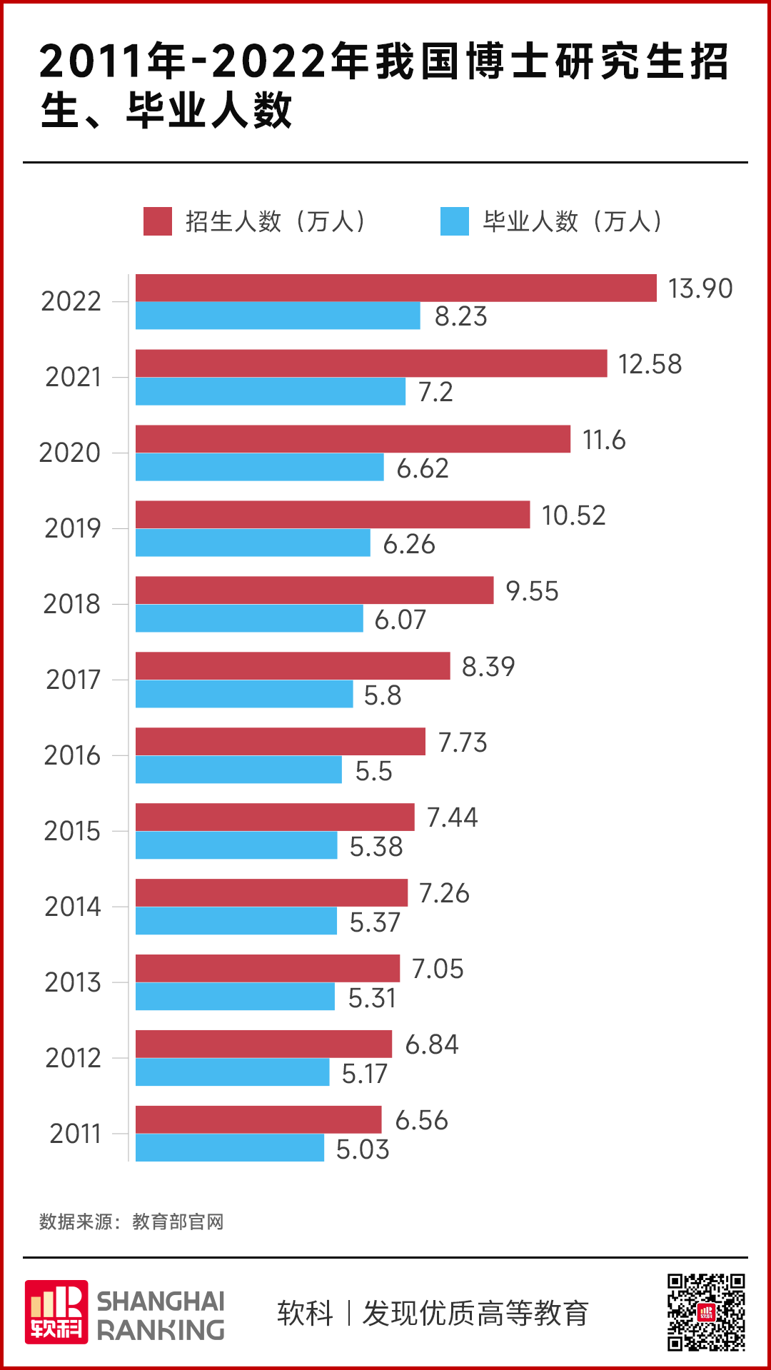 中国高等教育发展迅猛,完全进入普及化时代,博士群体不断扩大。公开数据显示,我国博士招生规模从2011年的6.56万人,扩招到2022年突破13万人。2023年3月,在教育部新闻发布会上,教育部发展规划司司长刘昌亚表示,“全国研究生在校生规模已经达到365.4万人,这两年增加比例比较快的是博士生,博士生的在校生规模已经达到55.6万人,是2012年的2倍。”