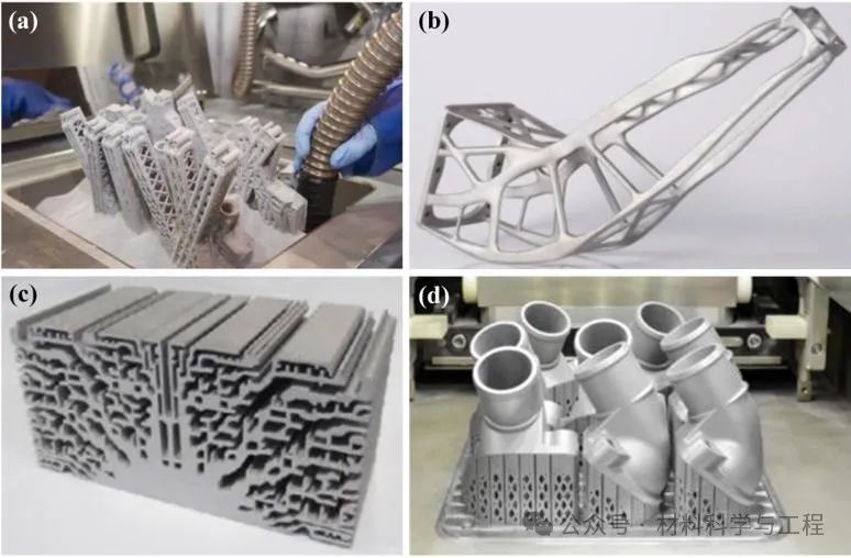 图1典型的LAM制造的铝合金零件。(a)采用Scalmalloy合金的AM客舱仿生隔板(来源:空客)。(b)采用AlSi10Mg合金制备的LAM卫星天线支架。(c)由A6061-RAM2制成的LAM散热器。(d) Mercedes卡车LAM备件。