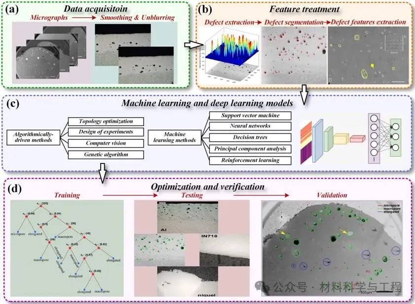 图5 LDED铝合金的机器学习过程。(a)机器学习的数据采集。(b)机器学习对采集特征进行处理。(c)提出了基于声信号处理和深度学习的原位缺陷检测框架。(d)机器学习的优化与验证。(插图)经许可使用。