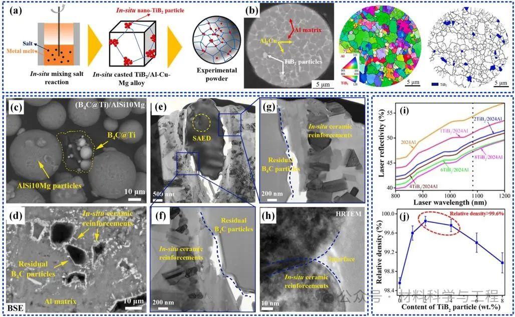图8内生颗粒在激光增材制造铝合金中的作用。(a)内生TiB2纳米颗粒制备Al-Cu-Mg粉末工艺路线示意图。(b)内生TiB2纳米颗粒Al-Cu-Mg粉末截面BSE图、EBSD图及相应的晶界图。(c) (B4C@Ti)/AlSi10Mg复合粉末的SEM。(d) LAM后添加B4C@Ti的AlSi10Mg基复合材料的BSE。(e)-(g) AlSi10Mg基复合材料中残余未反应B4C相附近微观结构的透射电镜。(h)内生陶瓷与Al基体界面的HETEM图。(i)不同含量的内生TiB2纳米颗粒/2024 Al粉末的激光反射率曲线。(j)不同TiB2纳米颗粒含量的LAM 2024铝合金的相对密度。(插图)经许可使用。