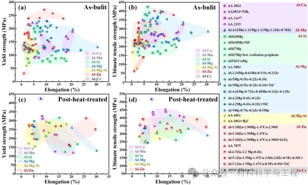 图12LDED加工不同系列铝合金的力学性能。(a)沉积态下屈服强度vs断裂延伸率;(b)沉积态下的极限抗拉强度vs断裂延伸率;(c)后热处理态下屈服强度vs断裂延伸率;(d) 后热处理态下极限抗拉强度vs断裂延伸率。