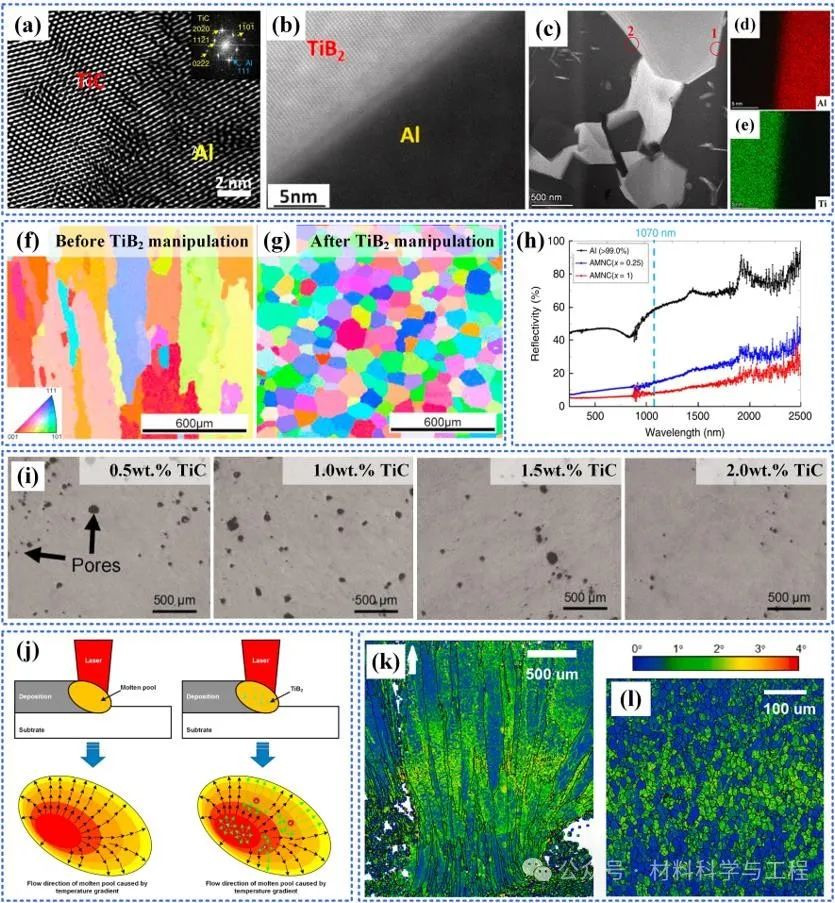 图7外加颗粒对LDED铝合金组织的影响。(a)和(b)分别为TiC/Al和TiB2/Al界面的HETEM图。(c-e) 3 wt.%TiB2p/2024Al的TEM图和(c)中位置1的Al和Ti元素分布图像。(f)和(g) LDED 2024铝合金和TiB2/2024铝合金的IPF图。(h)未加TiC和加TiC增强铝粉末的激光反射率。(i)不同TiC含量的LDED Al-Zn-Mg-Cu样品的OM图。 (j) LDED过程中Al 2024和TiB2/Al 2024熔池流动。 (k)和(l)分别为无TiC增强的LDED AA7075合金和经T6处理后TiC增强的LDED AA7075合金的KAM图。