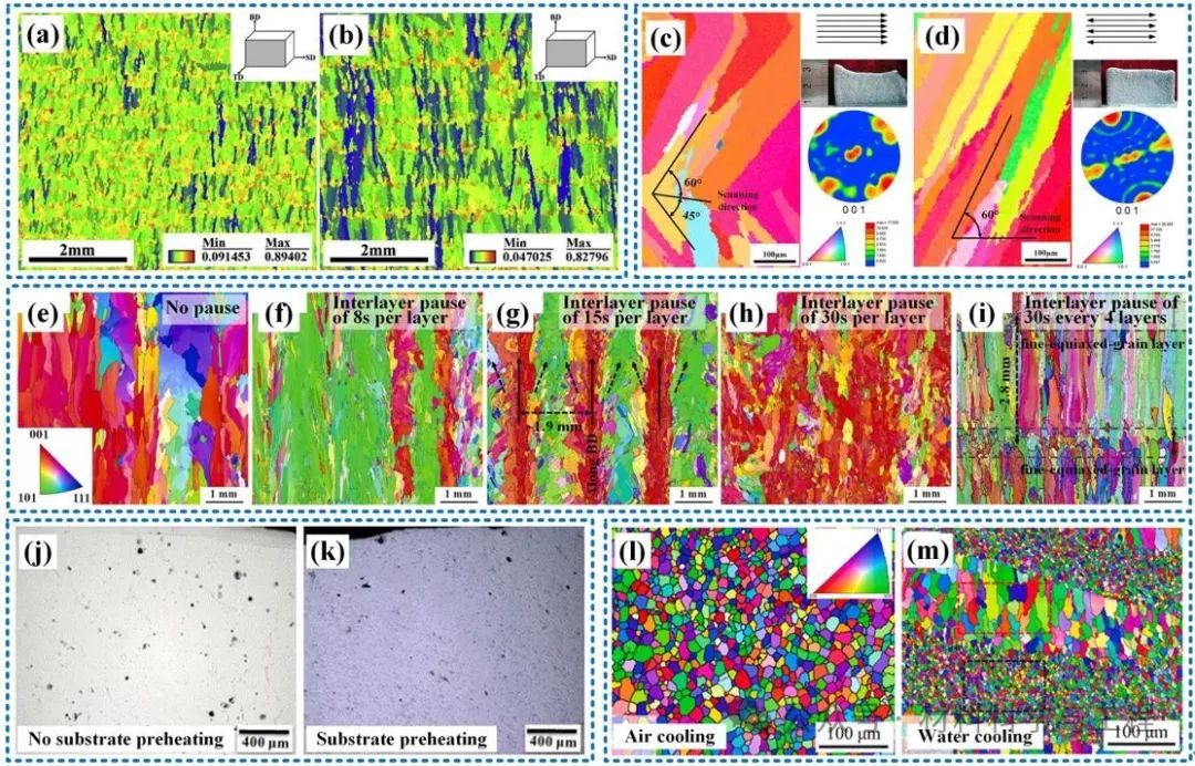 图4沉积相关参数对LDED铝合金组织的影响。(a)低层厚时晶粒分布图。(b)高层厚时晶粒分布图。 (c) Al2024双向LDED的IPF图。 (d) Al2024单向LDED的IPF图。(e-i) T6热处理后Al 6061的EBSD图,层间暂停分别为(e) 0 s, (f) 8 s, (g) 15 s, (h)30 s, (i)每4层30 s。(j)基板未预热的LDED Al 7075合金的光学显微镜分析。(k)经基板预热的LDED Al 7075合金的光学显微镜分析。(l)基板空冷的Al-Mg-Sc-Zr铝合金的光学显微镜分析。(m)基板水冷的Al-Mg-Sc-Zr LDED合金的光学显微镜分析。(插图)经许可使用。