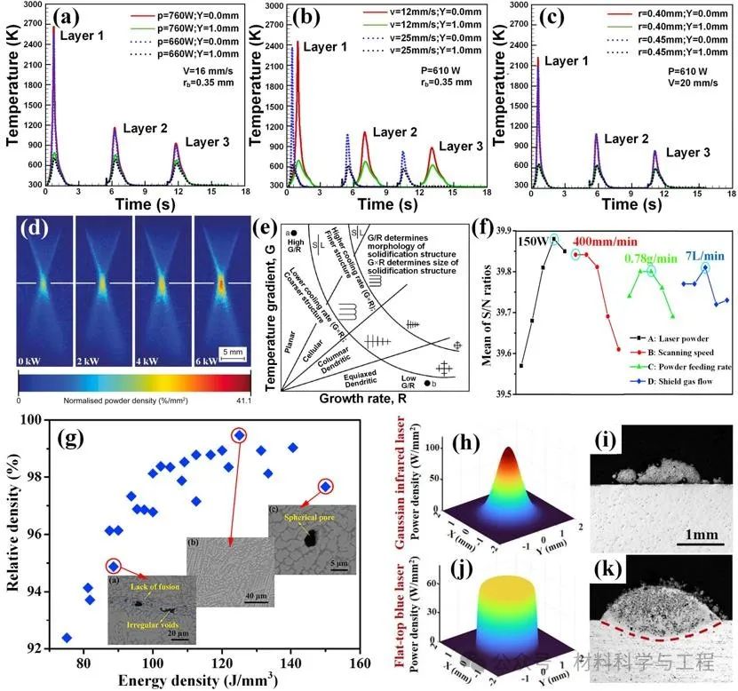 图3激光相关参数对LDED铝合金显微组织的影响。(a)不同激光功率,(b) 不同沉积速度,(c) 不同激光光斑尺寸下的LDED热循环。 (d)高速成像获得的AlSi10Mg粉末密度图。(e) 铝合金LDED中温度梯度与生长速率的关系图。 (f) AlSi10Mg合金LDED中S/N比-相对密度主效果图。 (g) AlSi10Mg合金的相对密度与能量密度的相关性。(h)高斯红外激光束的能量密度。(i)红外激光产生的熔池。(j)蓝色激光束的能量密度。(k)蓝色激光产生的熔池。