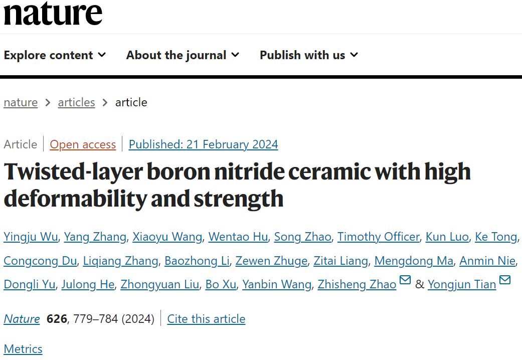 Moiré在范德华材料中由扭曲堆叠形成的超晶格,已经成为一个探索强相关材料的物理和其他涌现现象的新平台。然而,由于缺乏合适的三维块体材料制备策略,目前尚缺乏对扭层范德华材料力学性能的研究。在此,来自燕山大学的赵智胜&田永君院士等研究者报道了一种具有高室温变形能力和高强度的多晶氮化硼体陶瓷的成功合成。相关论文以题为“Twisted-layer boron nitride ceramic with high deformability and strength”于2024年02月21日发表在Nature上。