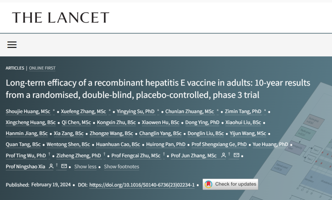 厦门大学研究团队通过高质量随访研究,证实全球唯一戊肝疫苗可提供至少长达10年的高效持久保护。近日,相关研究结果发表在国际医学权威期刊《柳叶刀》。