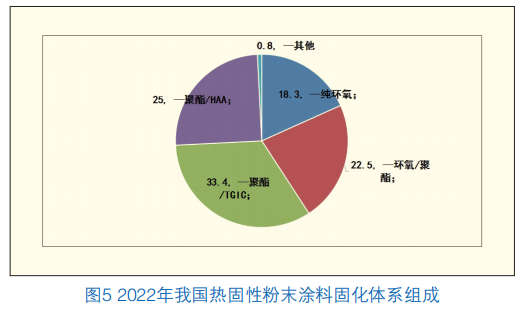 统计显示,2022年我国热固性粉末涂料中,纯环氧粉末涂料占比18.3%,环氧/聚酯混合型粉末涂料22.5%,聚酯/TGIC型粉末涂料33.4%,聚酯/HAA型粉末涂料25%,其他类型粉末涂料占0.8%。总体来看,各体系之间占比切换主要受成本影响,户外体系粉末产品对其他体系替代进一步加大(图5)。