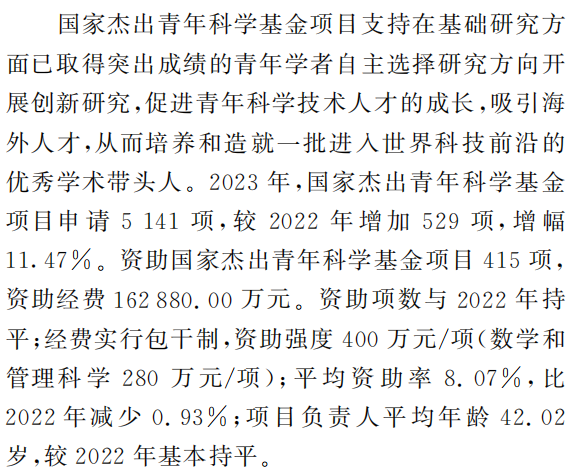2024年国家自然科学基金开展国家杰出青年科学基金项目结题分级评价及延续资助工作,确定评价等级并将其反馈依托单位作为国家杰出青年科学基金项目负责人科研表现的评价参考,同时择优遴选不超过 20%的项目给予第二个五年滚动支持,资助强度加倍,达到800万元/项构建对优秀人才的长周期稳定资助机制。