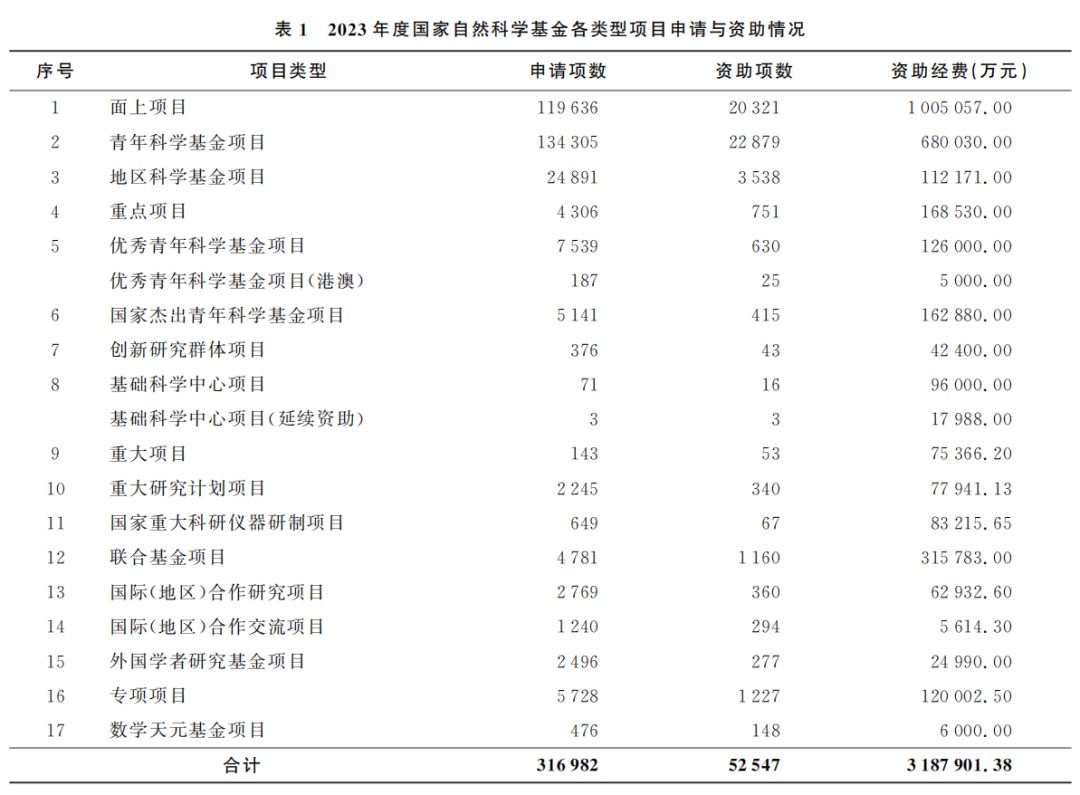 2023年,国家自然科学基金委员会共接收各类项目申请316982项,比2022年(306939项)增加3.27%,增幅较2022年的6.83%有所降低。其中,在项目申请集中接收期间,共接收2400个依托单位提交的13类项目申请304333项,同比增加9937项,增幅为3.38%。全年共受理项目申请315497项;对1485项项目申请不予受理。经过评审和审批程序,2023年度共批准资助各类项目52547项,经费合计3187901.38万元。