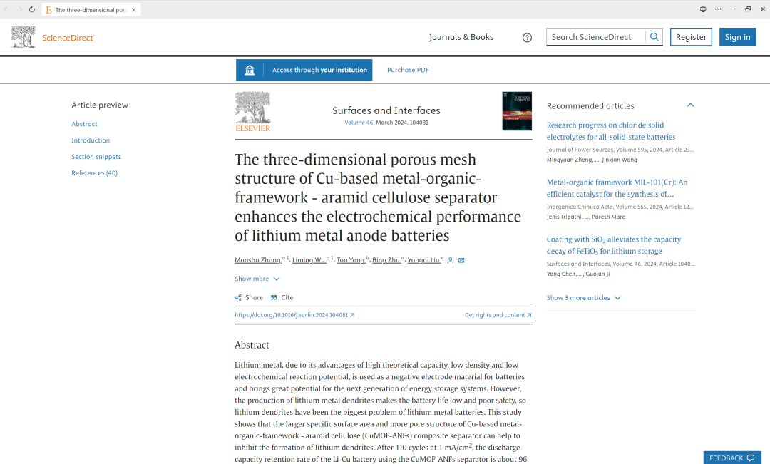 今天向大家介绍一篇近期发表在《Surfaces and Interfaces》杂志上的研究文章,该杂志是材料科学领域的一区期刊。这篇文章的通讯作者是来自中国地质大学材料科学与工程学院的 Yangai Liu 教授。文章在3月份已经在线发表。