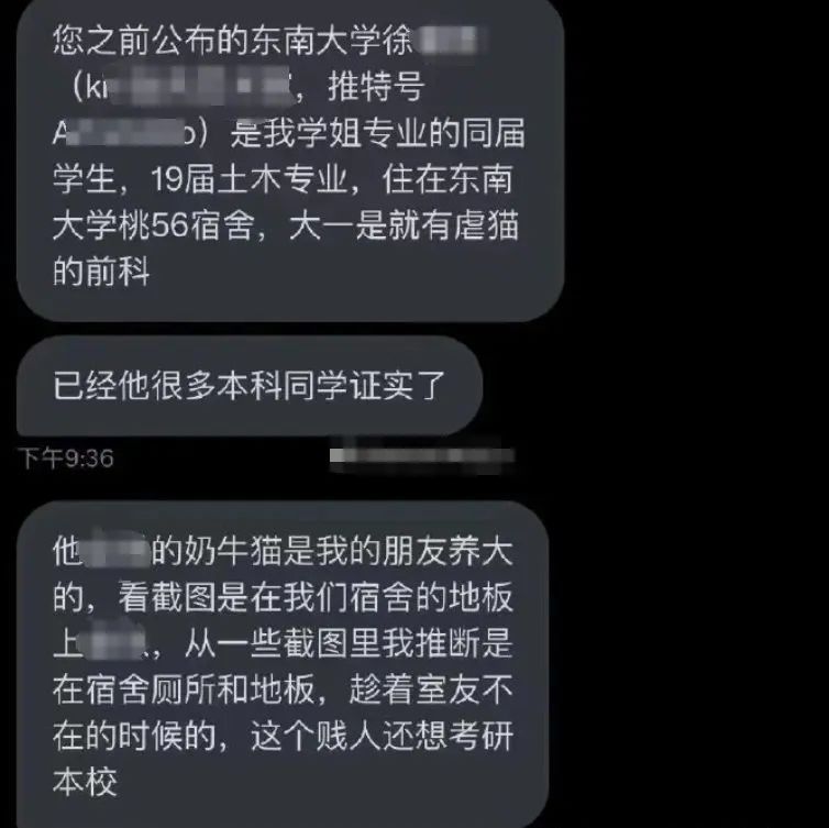另据新黄河3月4日报道,该名考生本科就读于东南大学土木工程学院,不久前身涉一起虐猫事件。他在学校宿舍虐杀猫,还录制视频上传到网络。一段流出的画面显示:他将一只奶牛猫放入水桶,然后用脚踩踏猫头……