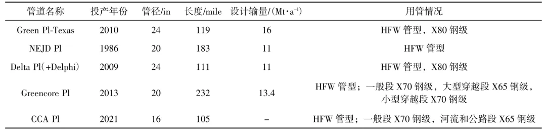 表4 北美地区部分超临界CO2输送管道设计参数及用管情况