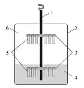 1.转轴 2.釜腔 3.聚四氟夹具 4.液相 5.腐蚀挂片 6.气相
