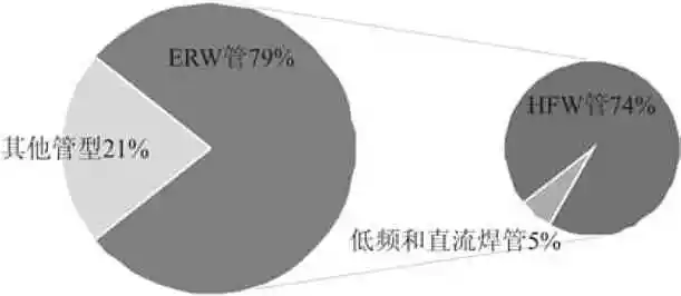 CO2输送管道主要采用高频电阻焊管(HFW),在北美地区CO2输送管道中HFW焊管占比达74%,钢级通常为X65~X80,如图4和表4所示。HFW焊管相较于其他ERW类焊管具有焊接速度快、热影响区小、使用范围广、尺寸规格宽等优点,自20世纪70年代以来,HFW技术广泛应用于输送管道建设。