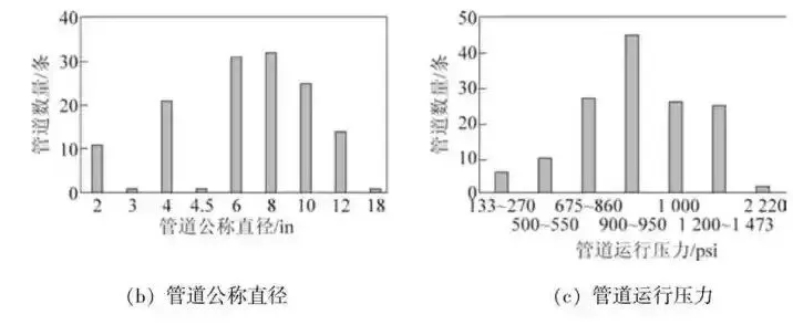 美国机械工程师协会统计了Air Products公司137条输氢管道的运营情况,如图5所示,其中90%的管道为X52钢级及以下的HFW焊管,管道公称外径50.8~457.2 mm,管道运行压力85%集中在4.5~10 MPa,最高运行压力达到15 MPa。