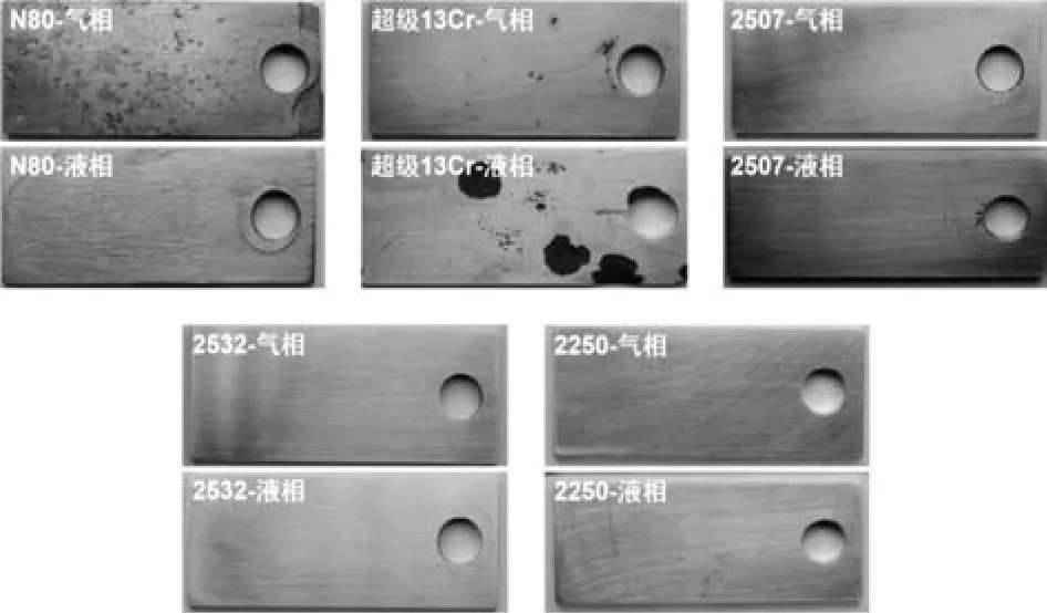 不同材质试样在气相和液相环境中的平均腐蚀速率和宏观腐蚀形貌如图7和图8所示。可以看出N80碳钢试样在气相和液相环境中发生了显著的均匀腐蚀减薄,平均腐蚀速率分别约为2.0 mm/a和2.6 mm/a;超级13Cr不锈钢试样在气相和液相环境中的平均腐蚀速率分别约为0.25 mm/a和1.0 mm/a,与N80碳钢不同的是,超级13Cr不锈钢的腐蚀以点蚀为主,特别是在液相环境中,试样表面的最大点蚀速率可高达50 mm/a;2507双相不锈钢试样在气相和液相环境中腐蚀轻微,主要是在挂片孔洞与聚四氟夹具接触位置处发生了缝隙腐蚀,平均腐蚀速率分别为0.015 mm/a和0.065 mm/a;2532和2250镍基合金的平均腐蚀速率极低,试样表面基本未发生明显腐蚀。