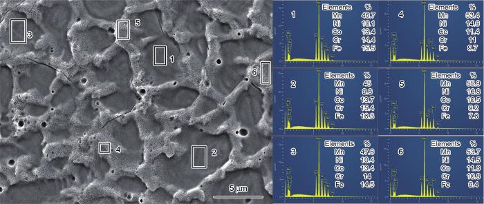 图2a给出了M50合金光滑表面的形貌。M50合金是单相FCC固溶体。为了确定表面的元素分布,对M50合金金相腐蚀后进行EDS分析,结果如图2b所示,可见M50合金表面的Mn和Ni有不同程度的偏析。对不同区域进一步进行EDS统计,得到枝晶和枝晶间的成分(图3)。从表1可见,枝晶的成分富Fe和Cr,枝晶间的成分富Mn和Ni。由于Mn和Cr、Fe的混合焓较大(分别为2和0 kJ/mol),在M50合金的快冷过程中容易被排挤出富含Cr、Fe的枝晶干区域;而Mn和Ni的混合焓为-8 kJ/mol,容易偏聚在枝晶间区域[33,34]。图4a给出了腐蚀后M50A催化剂的表面形貌,图4b~c给出了图4a中对应区域的放大图。可以看出,M50A的表面呈现多孔结构。图4d、e中的EDS面扫和能谱给出了M50A的成分,与表1中M50合金的枝晶成分相同。其原因是,在对M50化学腐蚀的过程中,枝晶内的成分富Cr和枝晶间成分富Mn使晶间偏析成分比枝晶内成分更容易腐蚀掉,因此在表面形成多孔结构。孔的直径约为5 μm,形成通道增大了比表面积,从而有利于提高电催化性能。