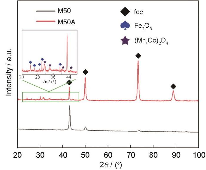 图1 M50高熵合金和M50A高熵催化剂的X射线衍射谱