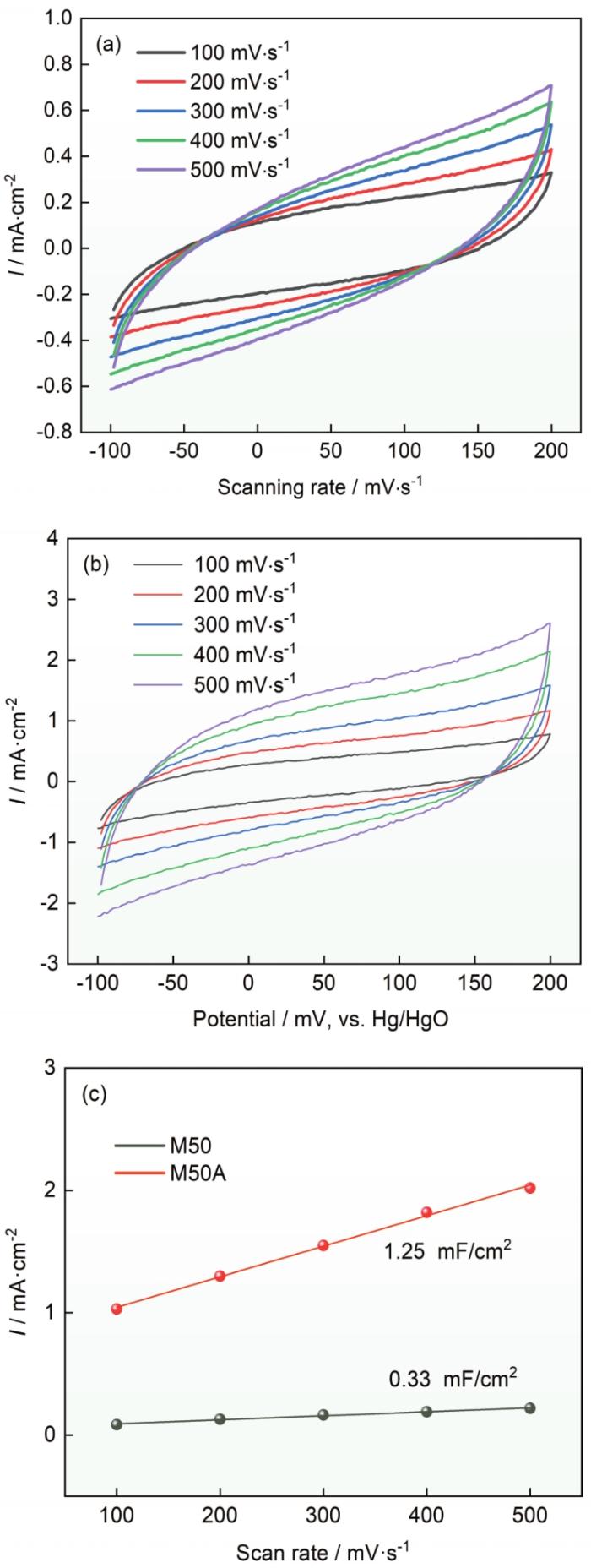 测试了制备出的电催化电极M50A的析氧性能,为了对比同时测试了M50合金和商业RuO2催化剂的析氧性能。图5a给出了不同电极材料的析氧性能。可以看出,M50A催化剂在电流密度为10 mA·cm-2时的析氧过电位为281 mV,低于商业RuO2的325 mV和M50合金的373 mV。Tafel斜率反映了电催化电极的催化动力学过程进行得更快,不同的数值反映了催化过程不同的速率决定性步骤。该数值越小,说明催化反应速率决定性步骤在多电子转移反应的末端,即催化性能越好。如图5b所示,M50A的Tafel斜率为63 mV·dec-1,而M50合金和商业RuO2的Tafel斜率分别为53和89 mV·dec-1。这表明,与M50合金相比,M50A催化剂的析氧动力学过程更快。为了进一步评估M50A电极的电化学性能,测量了M50和M50A的电催化活性面积。催化材料表面的电化学双层电容(Cdl)与ECSA之间存在正相关的关系,因此用CV曲线的非法拉第区进行Cdl值的测量。图6a、b给出了不同扫描速率的CV曲线,分析并计算出M50和M50A的Cdl分别为0.33和1.25 mF·cm-2 (图6c)。这表明,化学腐蚀后的M50A电催化电极表面的电催化活性面积更大,催化活性位点更多,因此电催化析氧性能更好。采用多步计时电位方法评估了M50A电催化性能。电流从10 mA·cm-2增加到50 mA·cm-2,每300 s增加10 mA·cm-2,达到50 mA·cm-2后再依次减小至10 mA·cm-2,并记录相应的电位变化。从50 mA·cm-2开始时电位立即稳定并在300 s内保持恒定,且在结束回到10 mA·cm-2的电压与对应电流的电压相等。这种计时电位响应的稳定性可以说明,M50A催化剂电极具有优异的质量传输特性(OH-向内扩散和氧气泡向外扩散)、导电性、机械稳定性和出色的耐腐蚀性。