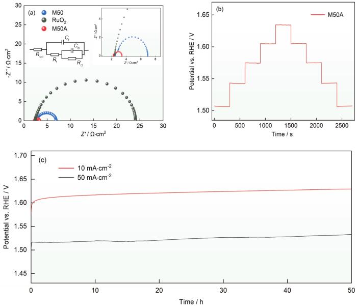 图7 M50、M50A和RuO2的阻抗谱(插图分别为拟合等效电路图和局部放大图)、M50催化剂多级计时电位响应以及在恒电流密度10和50 mA·cm-2条件下M50A的稳定性