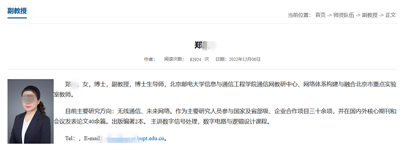 举报信息中称,“老师对我们就像是对待奴隶一样,越来越多与科研无关的事情占据了我们的时间,还伴随着无限的侮辱与谩骂。”网上公开信息显示,郑某,现为北京邮电大学副教授,在该校信息与通信工程学院工作。举报信息中称,郑某情绪极其不稳定,常常破口大骂,“你他妈”是其常挂嘴边的口头禅;郑某差遣实验室同学做了许多科研以外的事情,如长期代取大量快递,替其开车接送朋友、家人,去其家里打扫卫生;为其女儿做作业、接送上下学、在其女儿参加重要考试时代为作弊;多次帮其搬家、酒店开房;代其买花、养花,替其去商场退换货、维修等。