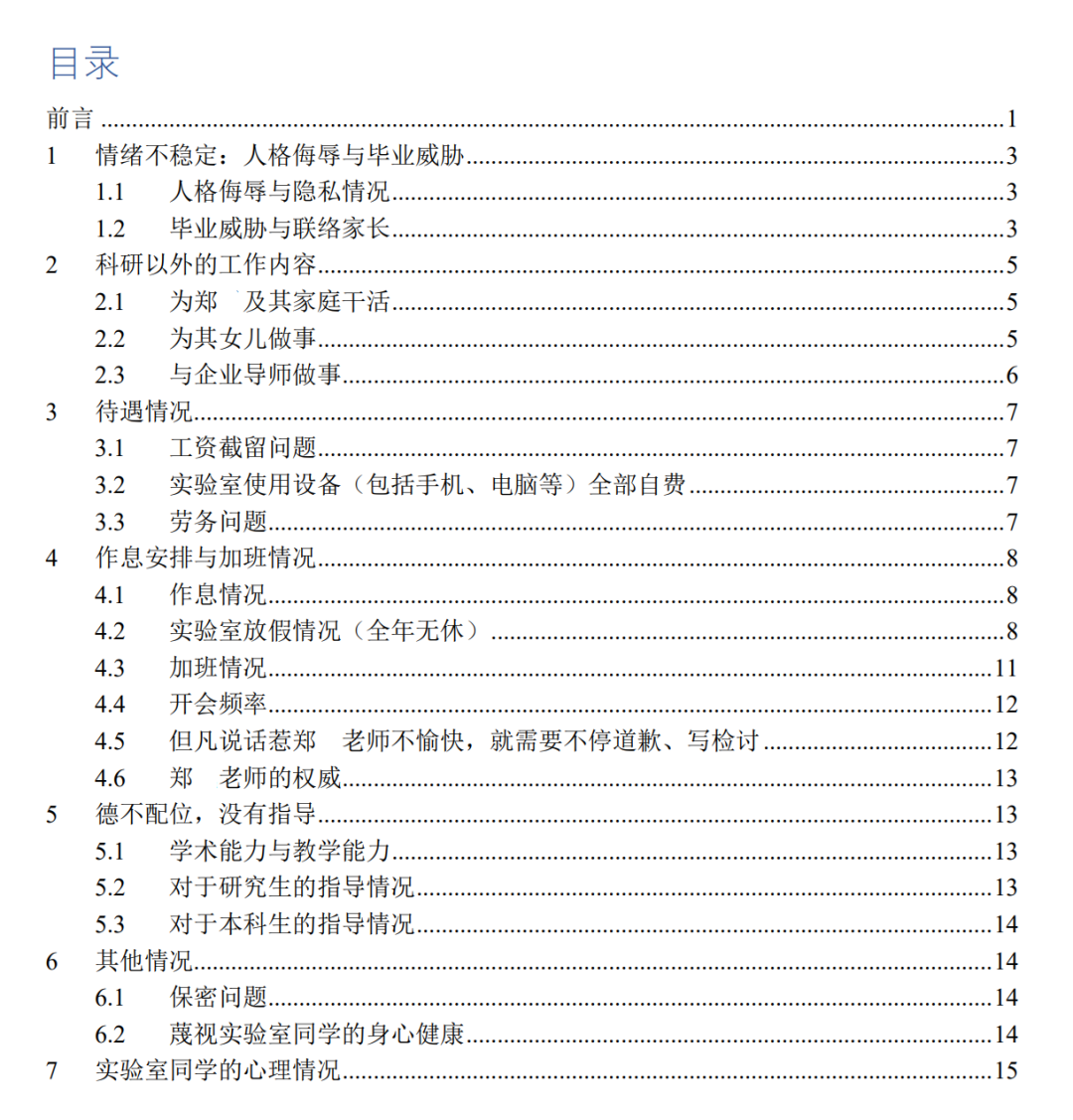 在举报材料中,15 名学生罗列出包括聊天记录、录音等证据,针对郑某在师德、师风方面的不当行为进行阐述,证明郑某不适合作为研究生导师,希望学校、学院能够明察秋毫,为他们所有人更换导师,并且保护他们直到毕业。