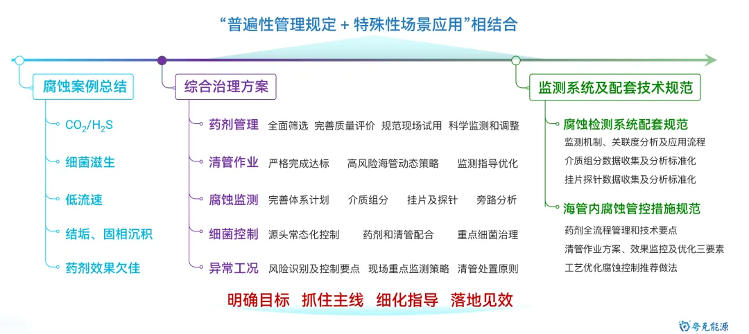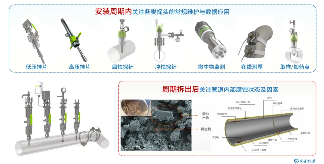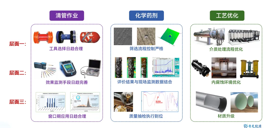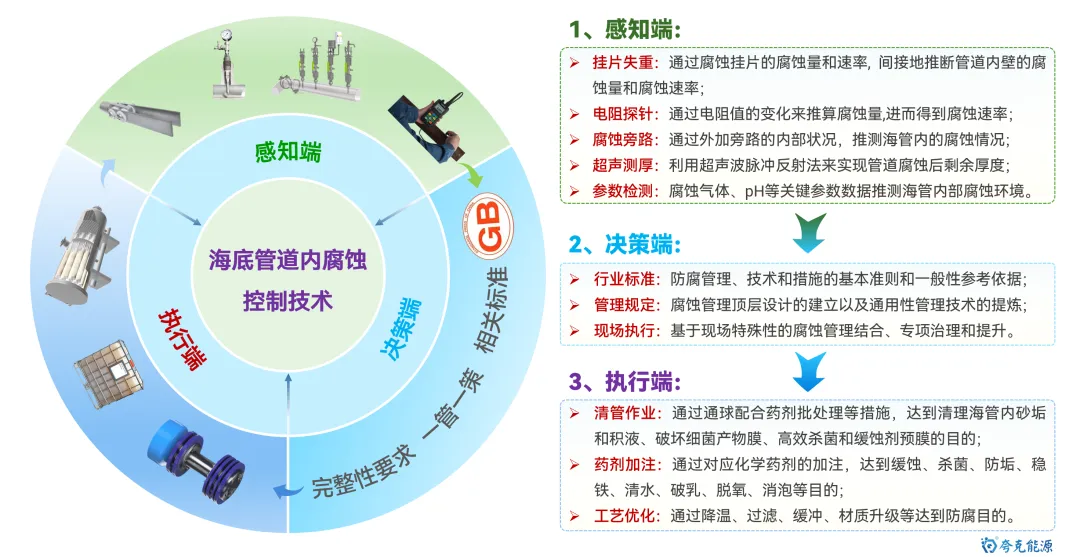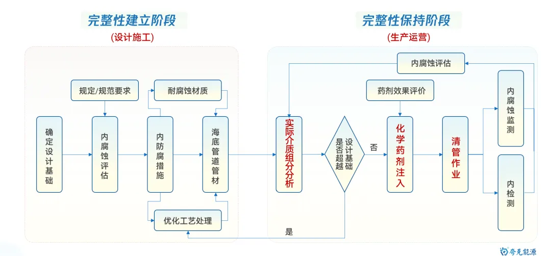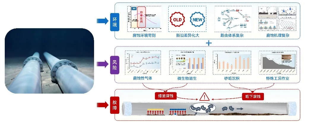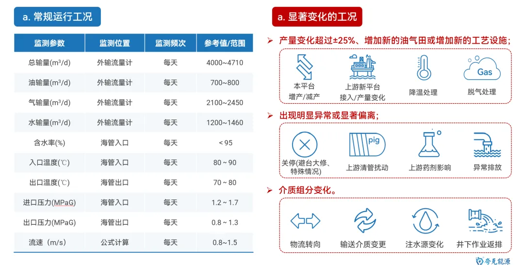 海底管道是海洋油气能源开发和运输的最重要动脉,保障其安全平稳运行极其重要。目前,随着海洋油气开发的深入,海管面临“新旧并存,含水差异、物流交汇、并联众多、介质干扰”的显著特点,管理难度逐渐增大。其中,内腐蚀是造成海底管道失效的最重要因素。 因此,如何通过数据收集客观反应腐蚀环境变化,并利用统计方法及数据分析手段,清晰掌握风险管控技术逻辑,制定更具针对性和精确性的管控措施,是管理方亟待解决的重要研究议题和技术攻关突破方向。 图1 海底管道内腐蚀管理面临挑战示意图 本文基于对海底管道内腐蚀管理的一些浅薄认识,梳理总结海底管道面临的内腐蚀风险,并尝试性地提出内腐蚀管控策略的相关思考和建议。内容如下: 一、内腐蚀风险类型概述 如前文《海底管道面临的内腐蚀风险概述》所述,海管内腐蚀主要类型如下图所示: 图2 海底管道内腐蚀风险类型示意图 CO2腐蚀 油气田最常见的腐蚀之一,同样pH下,CO2的总酸度比HCl高,会引起管道迅速的全面和局部腐蚀,最终造成失效。主要受到温度、压力、流速、pH值、介质组成、腐蚀产物膜等方面的影响。 H2S腐蚀 H2S溶于水中呈酸性,会造成管壁减薄或局部点蚀穿孔。主要受到材料因素、环境因素(浓度、pH值、温度、流速、Cl-)等方面的影响。研究表明微量H2S存在,对CO2腐蚀是有明显的抑制作用。 微生物腐蚀 油气田腐蚀管控难度较大的腐蚀类型,通过材料表面的生物膜中微生物的生命活动导致或促进材料腐蚀破坏多,多以布局点蚀为主。主要受到生物膜生产期、介质组分、砂垢形成的外部环境等方面的影响。 垢下腐蚀 一种金属表面沉积物形成的局部腐蚀,破坏性极大。当管道物流中携带淤泥、砂和固体颗粒形成沉积物。在与CO2、H2S、微生物等综合作用形成“大阴极、小阳极”的电偶效应,引发严重点蚀发生。主要受到固体颗粒、沉积速率和厚度、流速、环境因素等影响。 冲刷腐蚀 流体高速运动会破坏金属表面的保护膜或腐蚀产物膜,加速腐蚀过程。如果流体中含有固相颗粒,腐蚀会更为严重。主要受到材料本身性质、温度、pH、流态、流速、腐蚀产物膜值、过流部件形状等方面的影响。 顶部腐蚀 湿气输送过程中,当热传导使管壁温度低于水蒸气露点时,湿气中水蒸气在管道侧壁和顶部生成凝析水。含有酸性气体或可挥发腐蚀性物质,溶解于凝析水会对管道内壁造成严重的腐蚀。主要受到冷凝率、液态、流速、温度、挥发性腐蚀介质等方面的影响。 二、内腐蚀管控路线综述 基于完整性管理理念,海底管道腐蚀突出“全生命周期”的理念,从“设计、评估、措施、检测、监测、维修”形成管理循环,类似与PDCA循环提升思路。从生产运营阶段来看,内腐蚀管控可尝试划分为“感知端、决策段、执行端”,如图2所示: 图3 海底管道内腐蚀管控技术路线综述 感知端 数据具有代表性、持续性、及时性、可靠性及可追溯性,力求数据背后信息丰富详实,为内腐蚀的风险识别和评估提供最重要依据; 决策端 严格对标标准、规范、管理要求等,并汇总行业专家意见,形成可执行、能见效的防腐举措方案; 执行端 如现场采用高质量清管、高效能药剂加注,并配合工艺优化等手段,将腐蚀决策落地化、成果化,并积累执行经验。 三、感知端:准确、详实、可靠 生产工况数据感知 生产工况数据包括“正常状态下的工况运行”和“工况显著变化运行”两种情况,如图所示。 图4 生产工况感知组成示意图 a)正常状态下的工况运行 将在此工况基础上掌握数据波动基线,并依据制定常态化防腐方案和措施。类似于医院验血结果表,只要日常数据在波动范围内,可以认定腐蚀工况环境未发生,只要保持高质量防腐措施,腐蚀风险可控。 b) 工况显著变化运行 包括如产量增加、含水量、含气量变化、上游设施介入、药剂变更等,都属于“高速路偏移既定车道”,可能会造成现有防腐措施效果的降低或者失效。需要对这种情况做到先知先觉,尽可能预判并采取进一步的优化调整,确保腐蚀风险可控。一旦长期偏离,防腐措施未动态优化,会造成难以评价的腐蚀累积。 腐蚀监测数据感知 目前海洋油气田现场常用腐蚀数据或趋势获取途径如图5所示,当然还包括导波、内检测等技术,由于篇幅原因,暂未详细讨论。 图5 油气田常用腐蚀监检测技术综述 a) 腐蚀挂片 作为现场最为常用和关注的腐蚀监测手段,之前已开展过“浅谈油气田腐蚀挂片的拆装与分析”和“对挂片分析标准NACE SP0775-2023版修订内容的解读”等总结。需要说明的是,挂片的价值远大于所计算得出的平均腐蚀速率和点蚀深度,应严格按照标准对其安装状态、暴露环境、拆出形貌、附着物、微观形貌等进行全方位、多维度分析,从而更好反映出腐蚀趋势和可能风险。这也将作为将来腐蚀异常分析的最重要一手信息。 图6 基于标准规范要求的腐蚀挂片关注信息汇总图 b) 腐蚀探针 作为能连续反应现场腐蚀状态的监测装置,目前应用广泛和认可度高。探针数据结果能够和挂片信息进行良好对应,特别对特殊工况(钻完井返排、清罐排放、药剂调整、物流切换、产量变化等),能敏感观察到腐蚀环境的加剧性变化,并立即开展响应对应措施的调整。需要注意的是,现场探针的定期维护,对数据连续性和准确性非常重要。 图7 探针现场应用及管理要