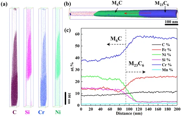 近期,中国科学院金属研究所特种合金研究部在前期高温δ铁素体演变行为对奥氏体不锈钢力学性能和腐蚀性能影响研究的基础上(Metall. Mater. Trans. A,51 (2020) 2998; J. Mater. Sci. Technol.,114 (2022) 7;Mater. Charact.,211 (2024) 113930),进一步揭示了服役温度下新型硅增强奥氏体不锈钢中高温δ铁素体分解的新机制。与传统奥氏体不锈钢中高温δ铁素体快速分解的现象不同,硅增强奥氏体不锈钢中高温δ铁素体分解被抑制,取而代之的是诱发了相邻奥氏体的分解(图1)。首先,二次M23C6碳化物的优先形成在消耗C含量的同时,会将Si排斥至周围奥氏体,诱导富Si贫C微区内奥氏体向α铁素体的转变(图2)。其次,二次M23C6碳化物粗化过程导致Ni和Si原子被逐渐排斥至M23C6/γ和M23C6/α界面,Ni和Si之间的强烈吸引作用,促进了M6C碳化物和G相的析出(图3)。随着奥氏体分解的进行,M6C/α界面上较高的应变不相容导致脆性解理断裂,显著降低合金冲击韧性。这一新机制的澄清为耐强腐蚀介质的长寿命奥氏体不锈钢研制提供了理论基础。相关结果以“Austenite decomposition behavior adjacent to δ-ferrite in a Si-modified Fe-Cr-Ni austenitic stainless steel during thermal aging at 550 °C”为题发表于Acta Materialia 272 (2024) 119948。博士生谢昂为第一作者,陈胜虎研究员和戎利建研究员为共同通讯作者。该研究工作得到了国家自然科学基金、中核集团领创科研项目和中核集团青年英才项目的资助。图2. 高温δ铁素体周围M23C6优先形成导致富Si贫C微区的形成图3. M23C6粗化排斥Ni和Si原子诱导 M6C的析出