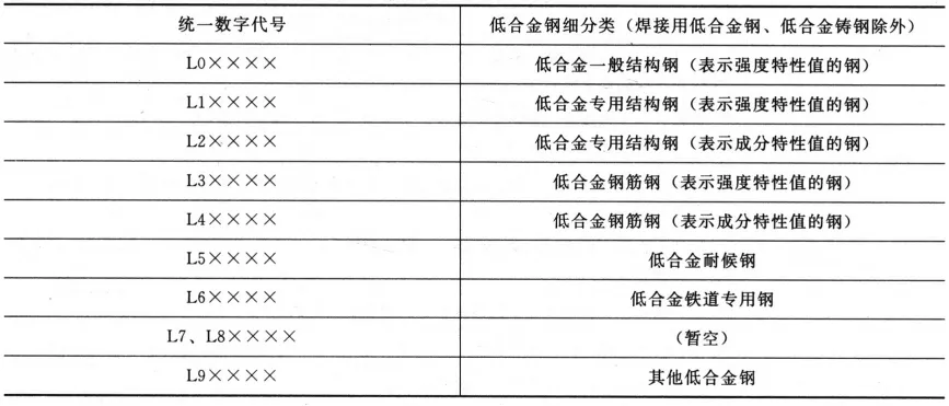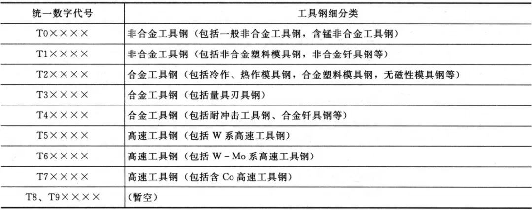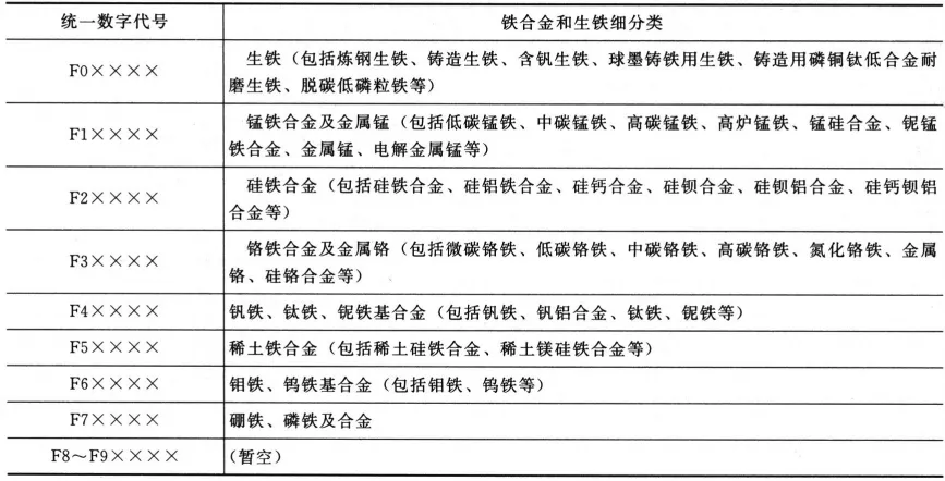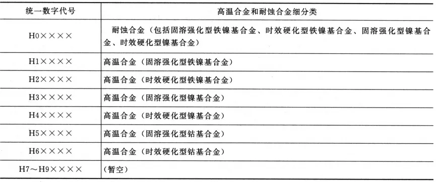 表7 高温合金和耐蚀合金细分类与统一数字代号