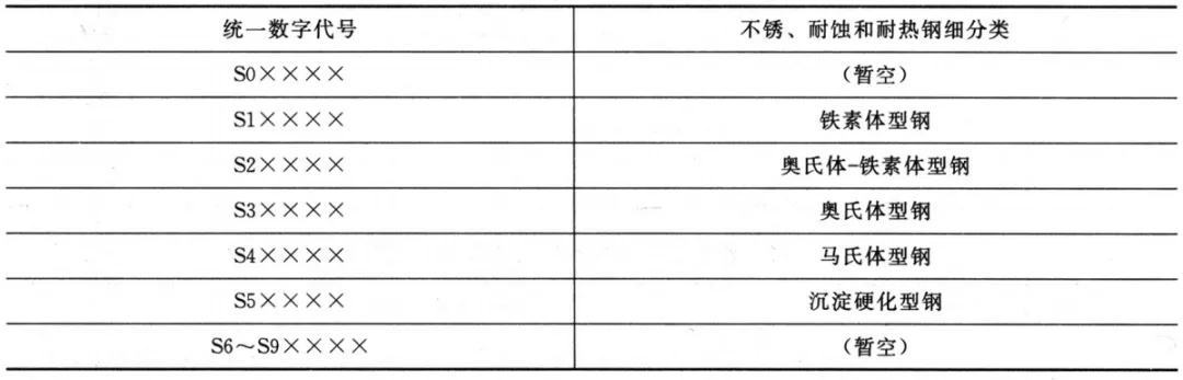 表13 不锈、耐蚀和耐热钢细分类与统一数字代号