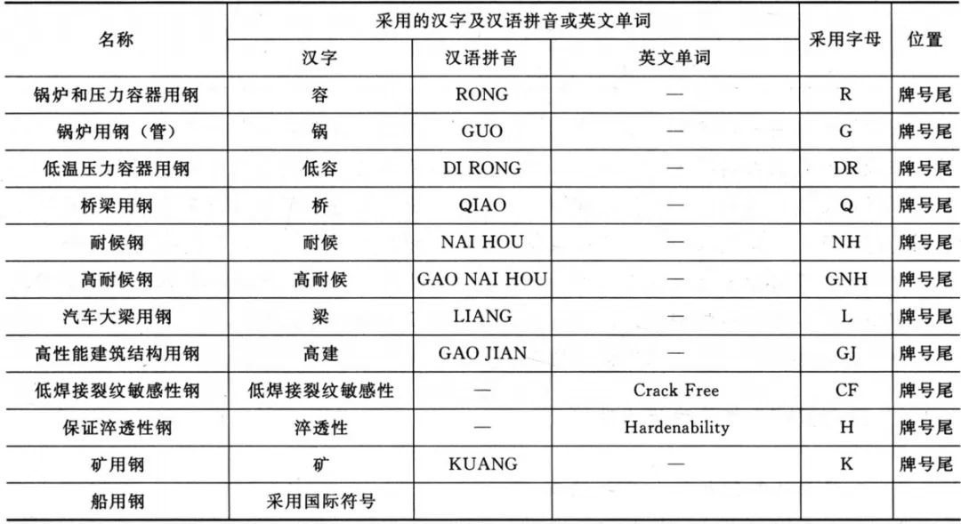 第一部分:前缀符号十强度值(以N/mm2或MPa为单位),其中通用结构钢前缀符号为代表屈服强度的拼音字母“Q”,专用结构钢的前缀符号见表18;