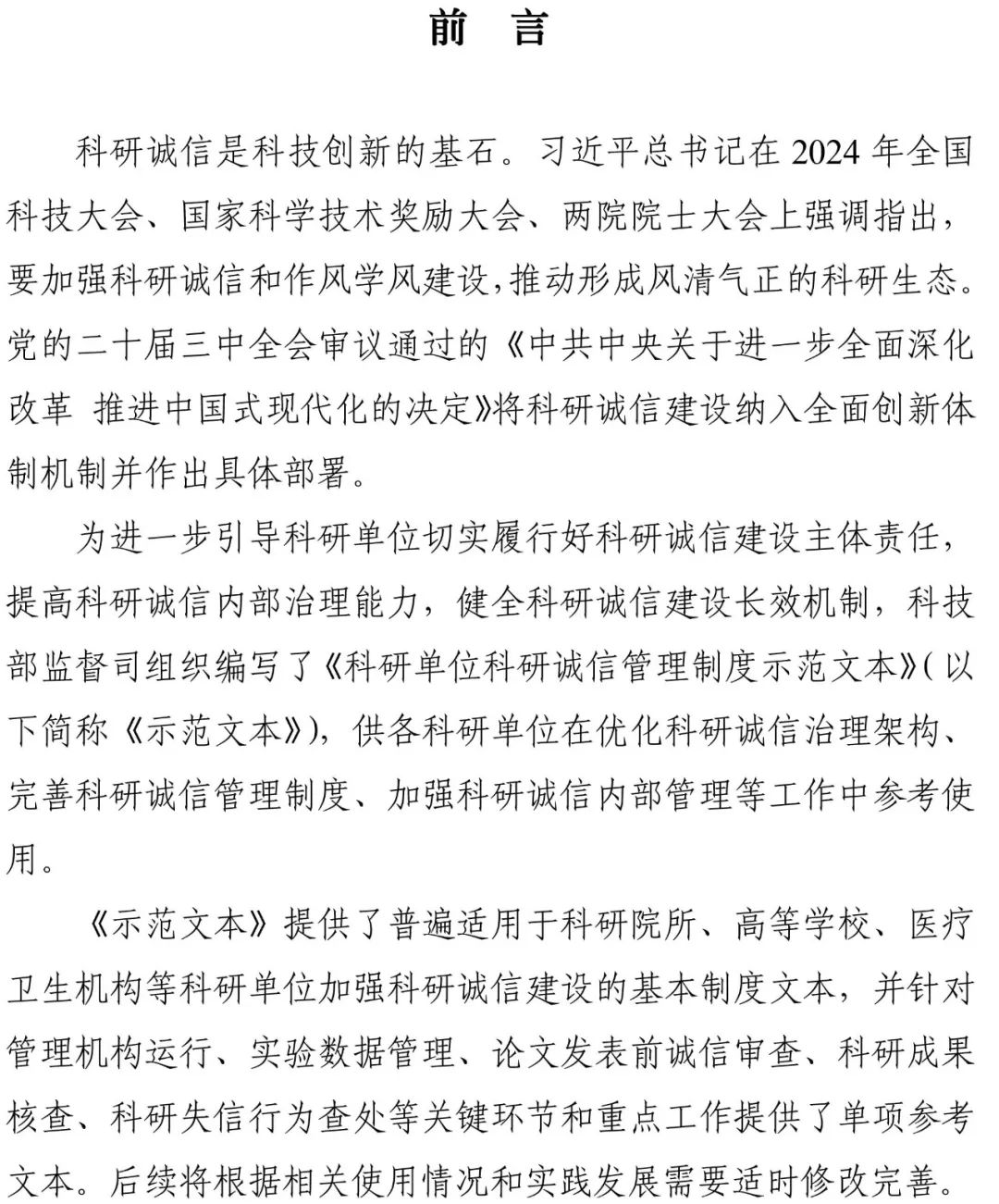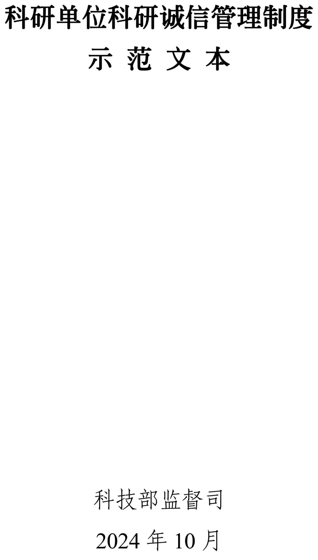 近期,科技部监督司发布《科研单位科研诚信管理制度示范文本》。为进一步引导科研单位切实履行好科研诚信建设主体责任,提高科研诚信内部治理能力,健全科研诚信建设长效机制,科技部监督司组织编写了《科研单位科研诚信管理制度示范文本》,供有关部门、地方和单位在加强科研诚信建设工作中参考使用。
