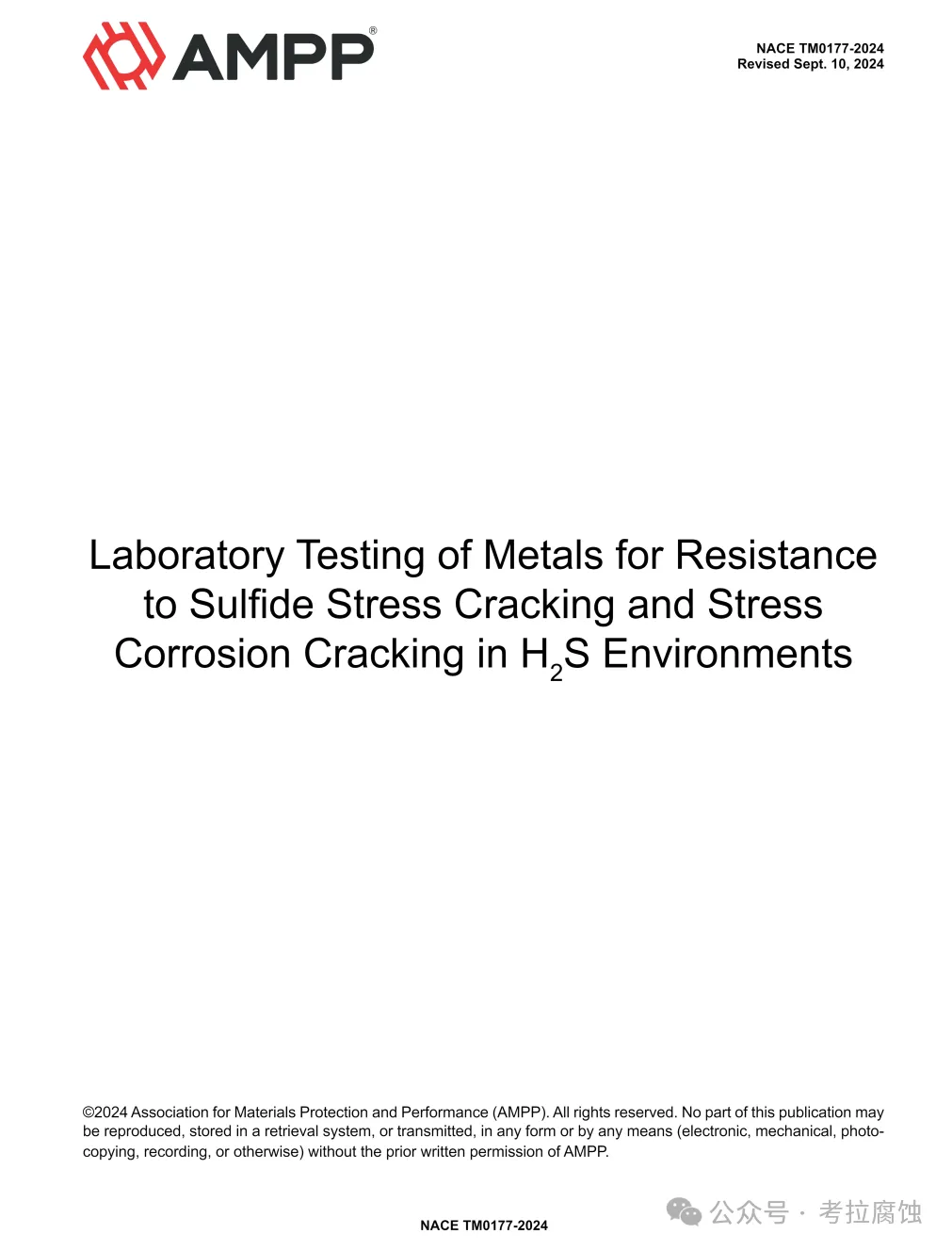 NACE TM0177-2024 Laboratory Testing of Metals for resistance to Sulfide Stress Cracking and Stress Corrosion Cracking in H2S Environments 金属在硫化氢环境中抗硫化物应力开裂和应力腐蚀开裂的实验室试验方法。2024最新版主要章节有: