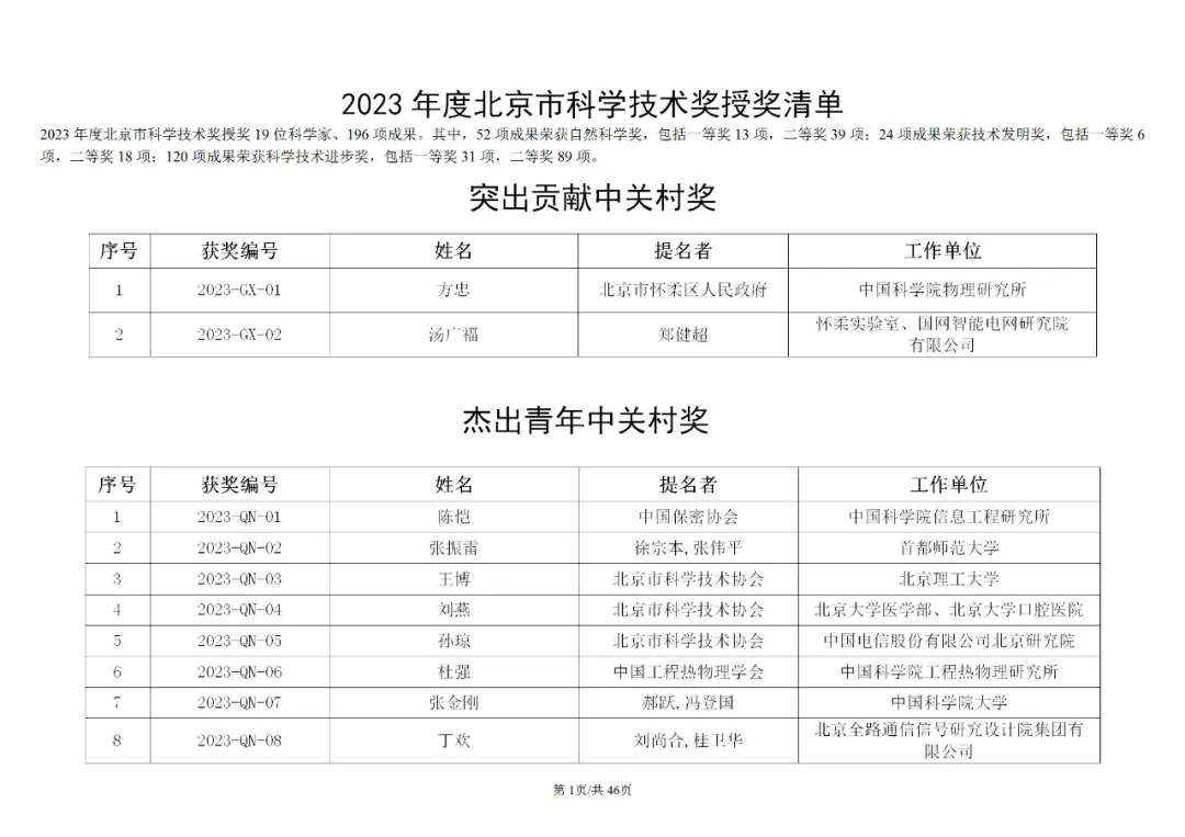 方忠、汤广福荣获突出贡献中关村奖;陈恺、张振雷、孙琼、杜强等8人荣获杰出青年中关村奖;博思维克、本诺伊·帕克丹姆等9人荣获国际合作中关村奖。