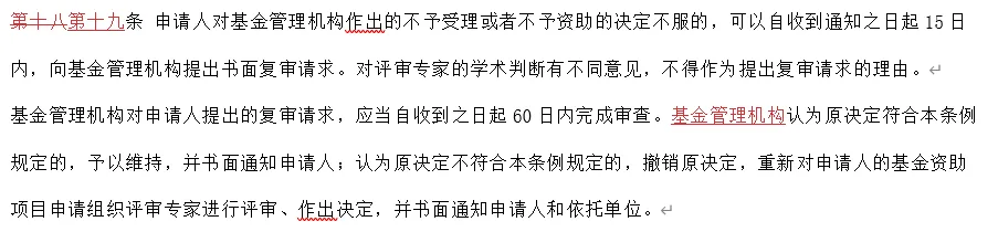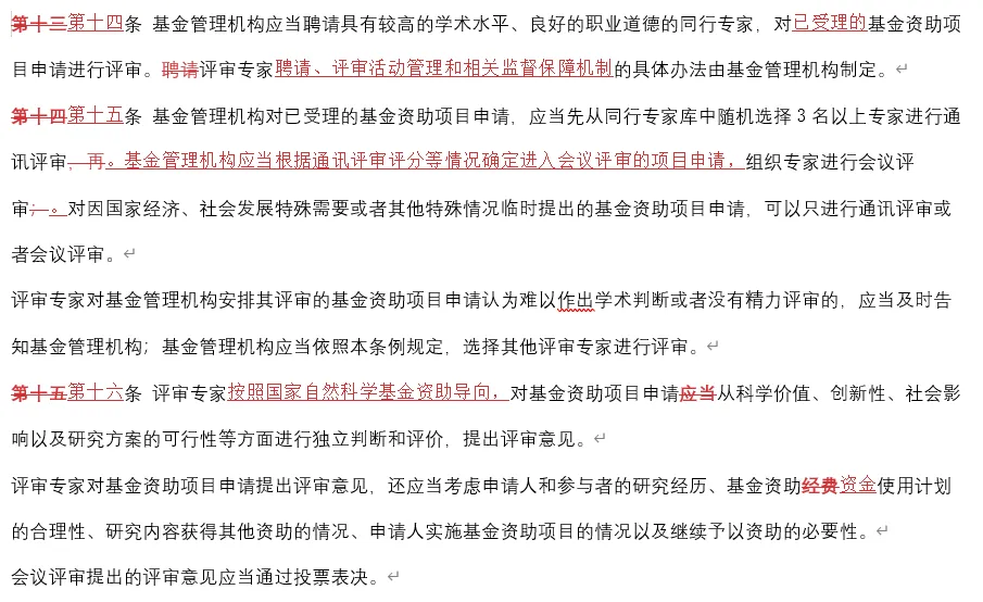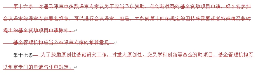 原先的十三、十四、十五条未有显著改动。其改动程度和第一章第一条差不多,仅有的改动也只是细化基金管理机构的工作流程,提高评审专家的相关规定的语言表述严谨性。但原先的第十六条:“对通讯评审中多数评审专家认为不应当予以资助,但创新性强的基金资助项目申请,经2名参加会议评审的评审专家署名推荐,可以进行会议评审。但是,本条例第十四条规定的因特殊需要或者特殊情况临时提出的基金资助项目申请除外。基金管理机构应当公布评审专家的推荐意见。”已完全删去。现更改为第十七条:“为了鼓励原创性基础研究工作,对重大原创性、交叉学科创新等基金资助项目,基金管理机构可以制定专门的申请与评审规定。”在原先的第十七条中将公布被资助项目相关信息的规定删去,然后额外添加了一项针对基金管理机构的规定:“基金管理机构在作出资助决定前,应当按照国家有关规定,通过科研诚信管理信息系统,及时开展严重失信行为数据比对、核查等工作。”原先的第十八条的修改仅是为“认为原决定符合本条例规定的”这半句话加了主语“基金管理机构”
