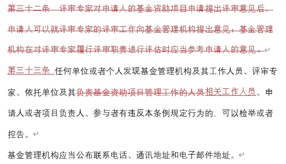 原先第三十一条的第二段被大规模修改,目前最新规定为“基金管理机构应当配合国务院财政部门和科学技术主管部门开展基金绩效评价,并应当按照全面实施预算绩效管理的要求,建立健全绩效管理制度,定期对基金使用情况开展绩效评价,强化绩效评价结果应用,加大绩效信息公开力度。”原先第三十二条的前半部分“评审专家对申请人的基金资助项目申请提出评审意见后,申请人可以就评审专家的评审工作向基金管理机构提出意见;基金管理机构在对评审专家履行评审职责进行评估时应当参考申请人的意见。”被删除,仅保留了后半部分规定。